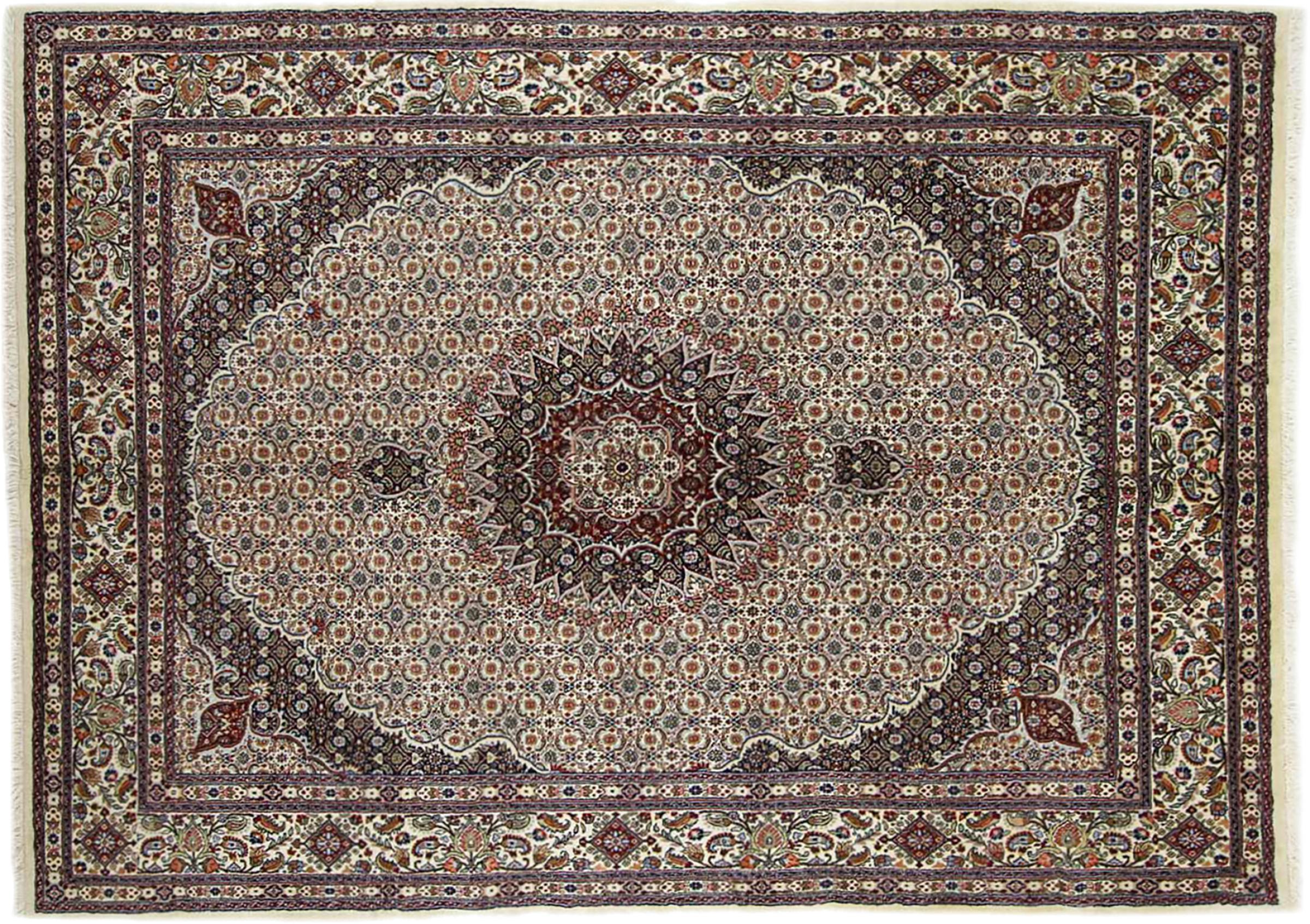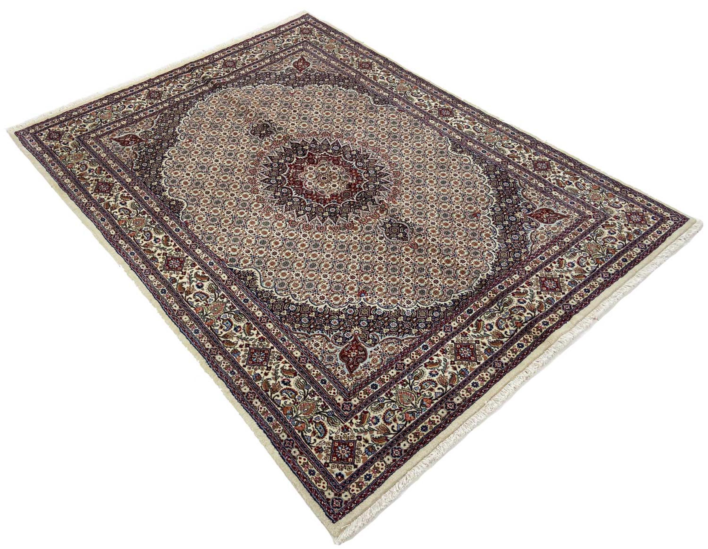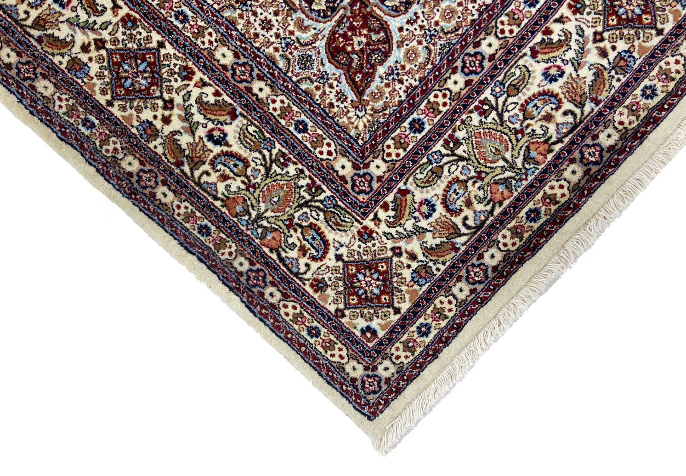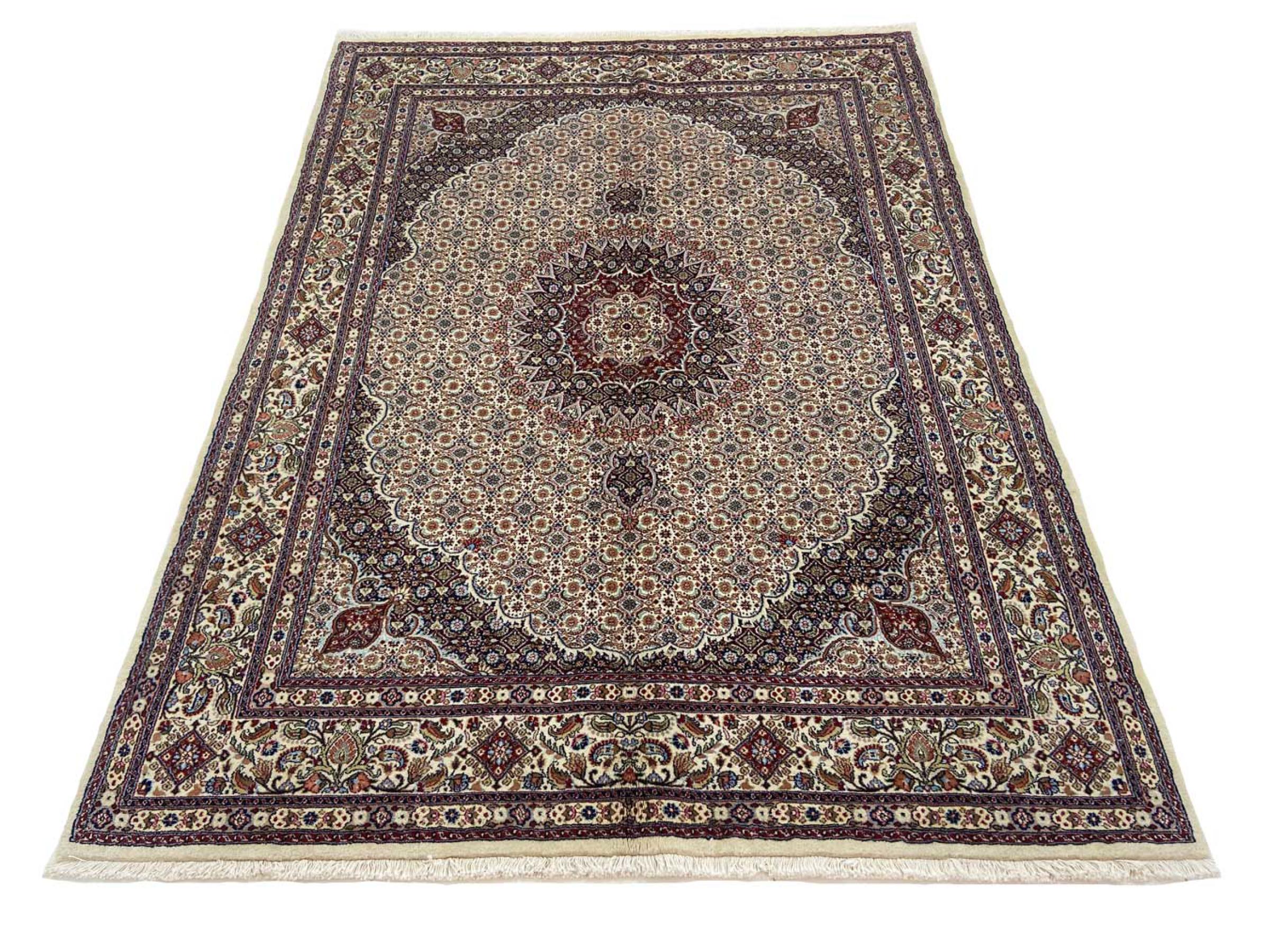This carpet from Moud, a city 300 kilometres south of Mashhad, impresses at first glance. The typical Herati pattern or garden design is appreciated by connoisseurs and lovers of genuine Persian rugs. If you are looking for a handmade rug of fine quality with a very unique and distinctive design, this type of rug is the perfect choice.