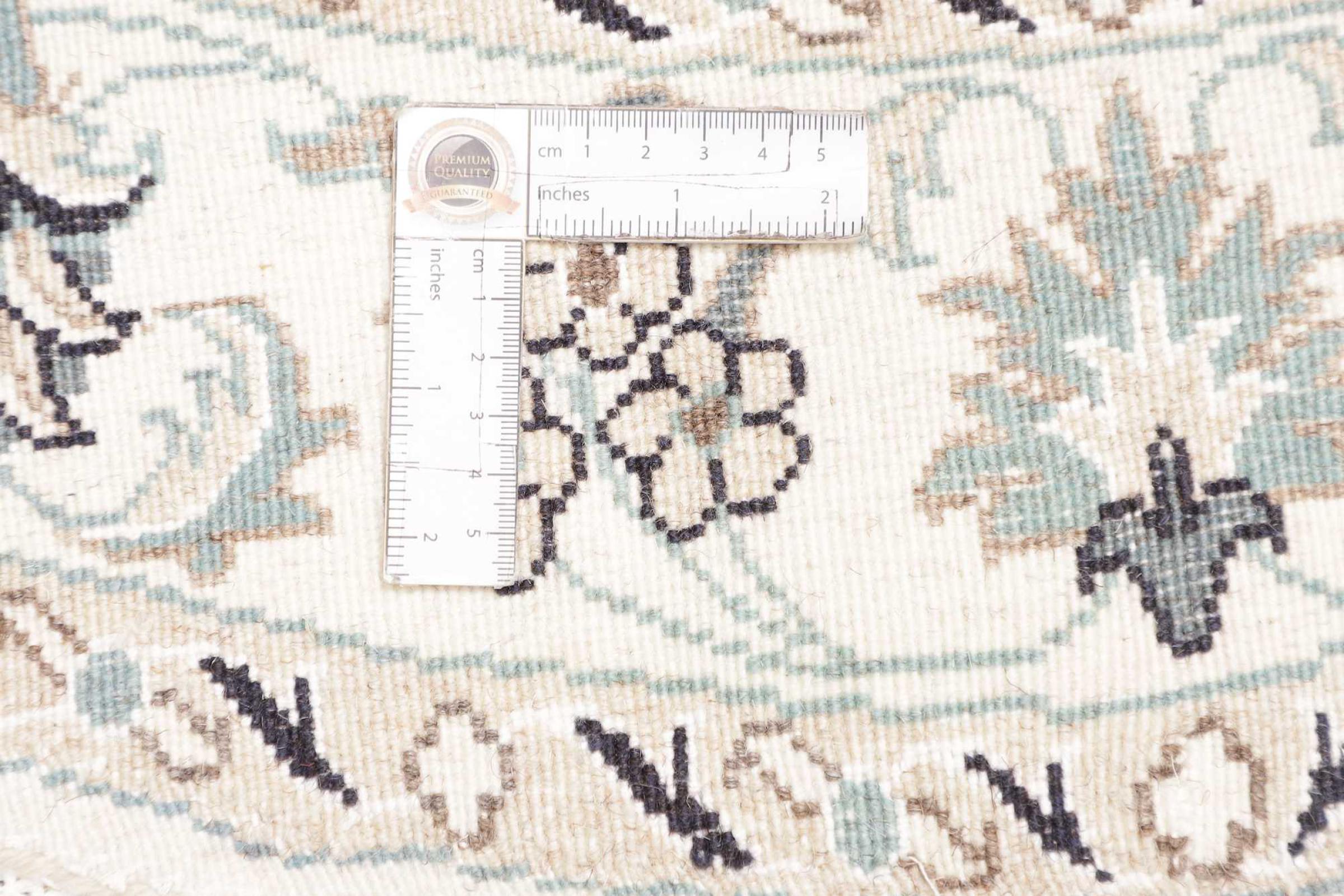 This Nain rug is classified as 12La. Its typical Nain colour scheme gives it an elegant and sophisticated look. This Persian rug was hand-knotted in the city of Nain, which lies on the western edge of the Dasht-e-Kavir desert, using high-quality wool and natural silk. At 12La, it is not as finely detailed with ornamentation as a Nain 9La or 6La.