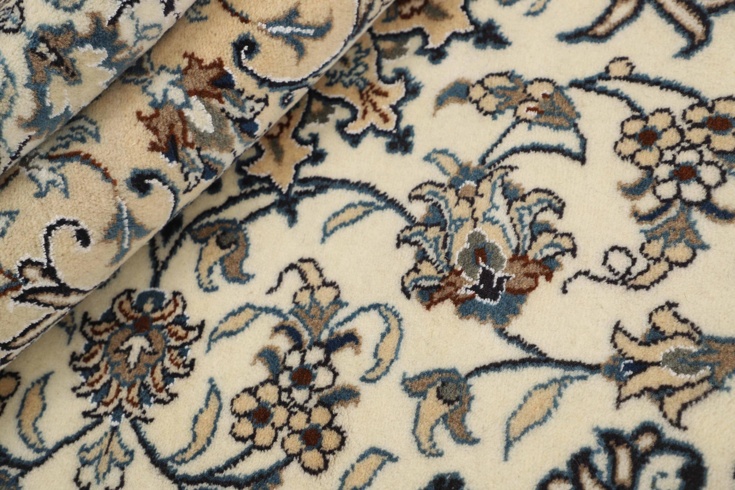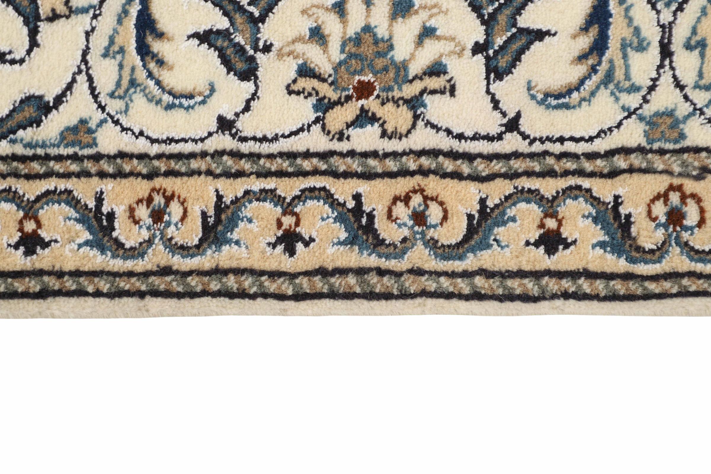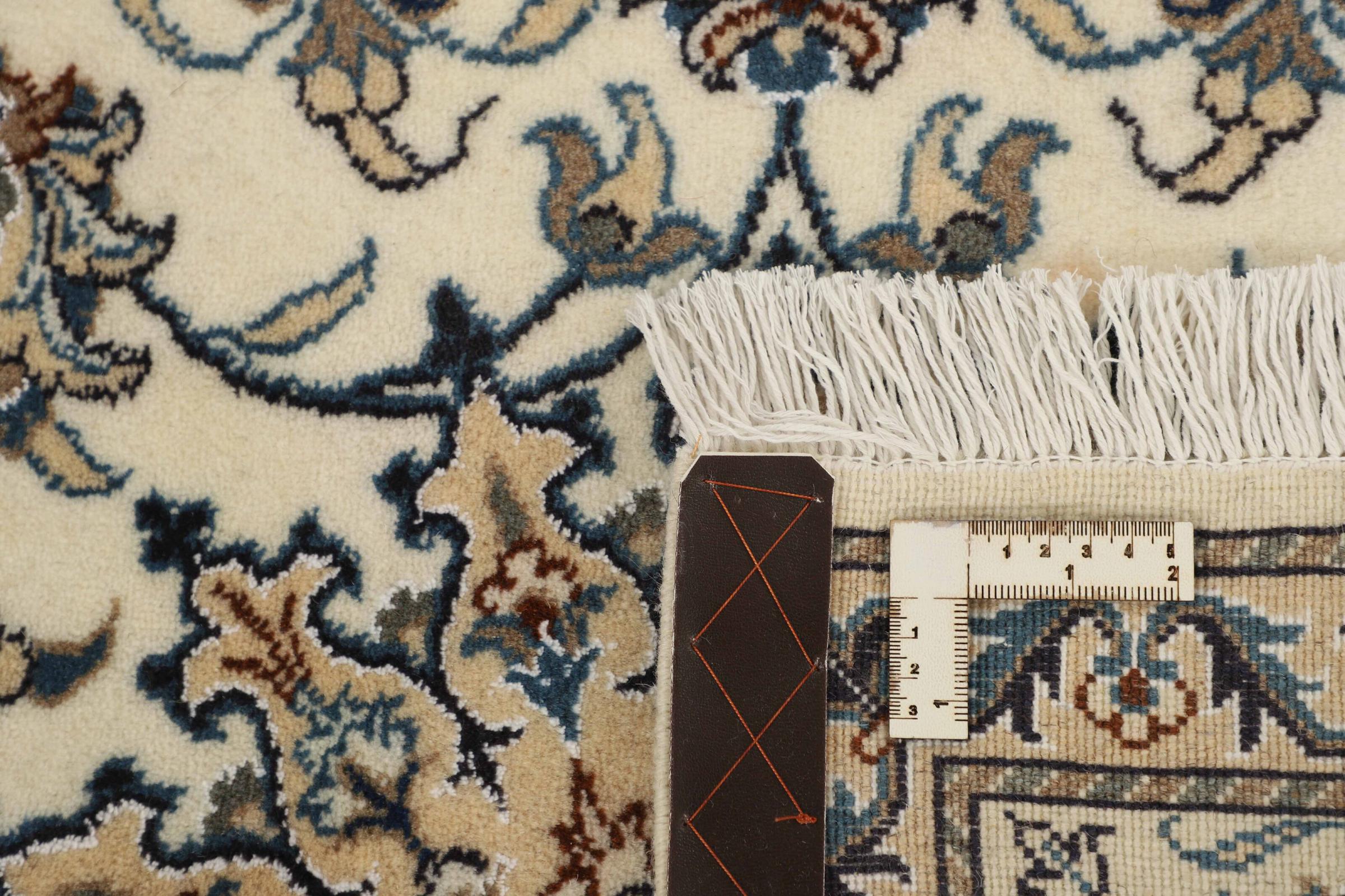 This Nain rug is classified as 12La. Its typical Nain colour scheme gives it an elegant and sophisticated look. This Persian rug was hand-knotted in the city of Nain, which lies on the western edge of the Dasht-e-Kavir desert, using high-quality wool and natural silk. At 12La, it is not as finely detailed with ornamentation as a Nain 9La or 6La.