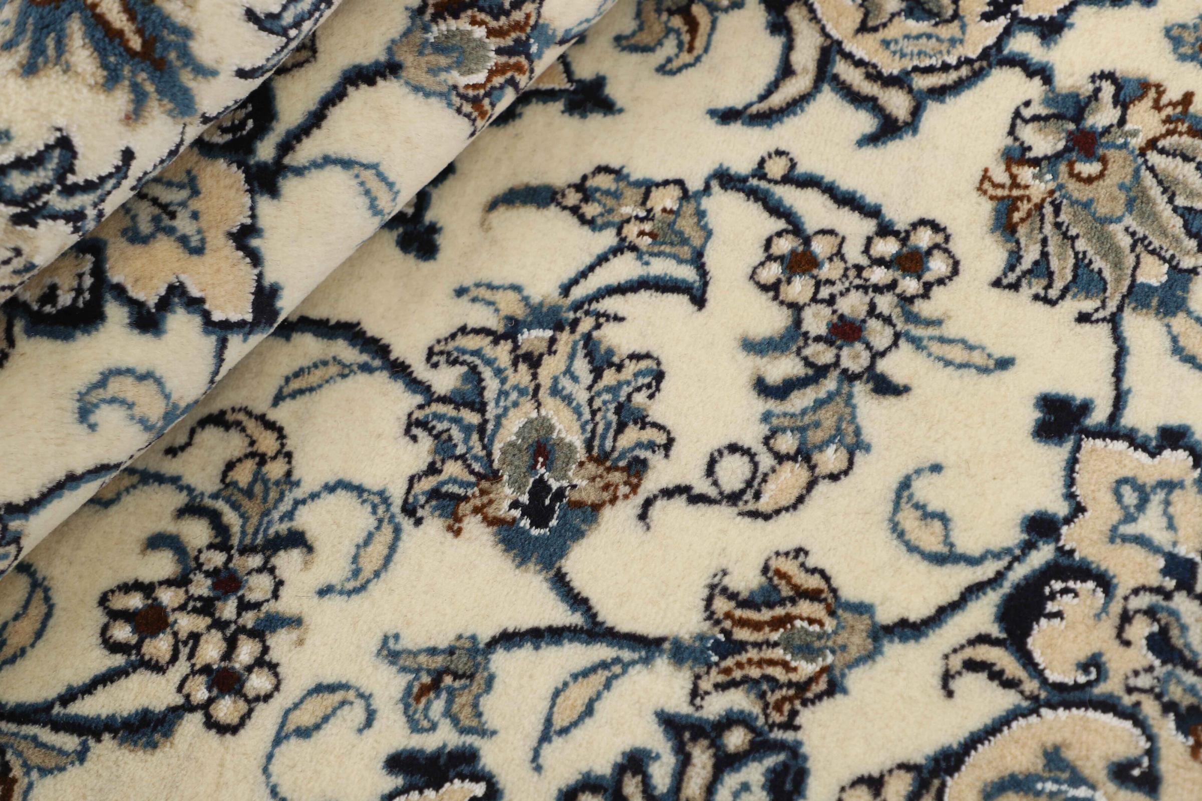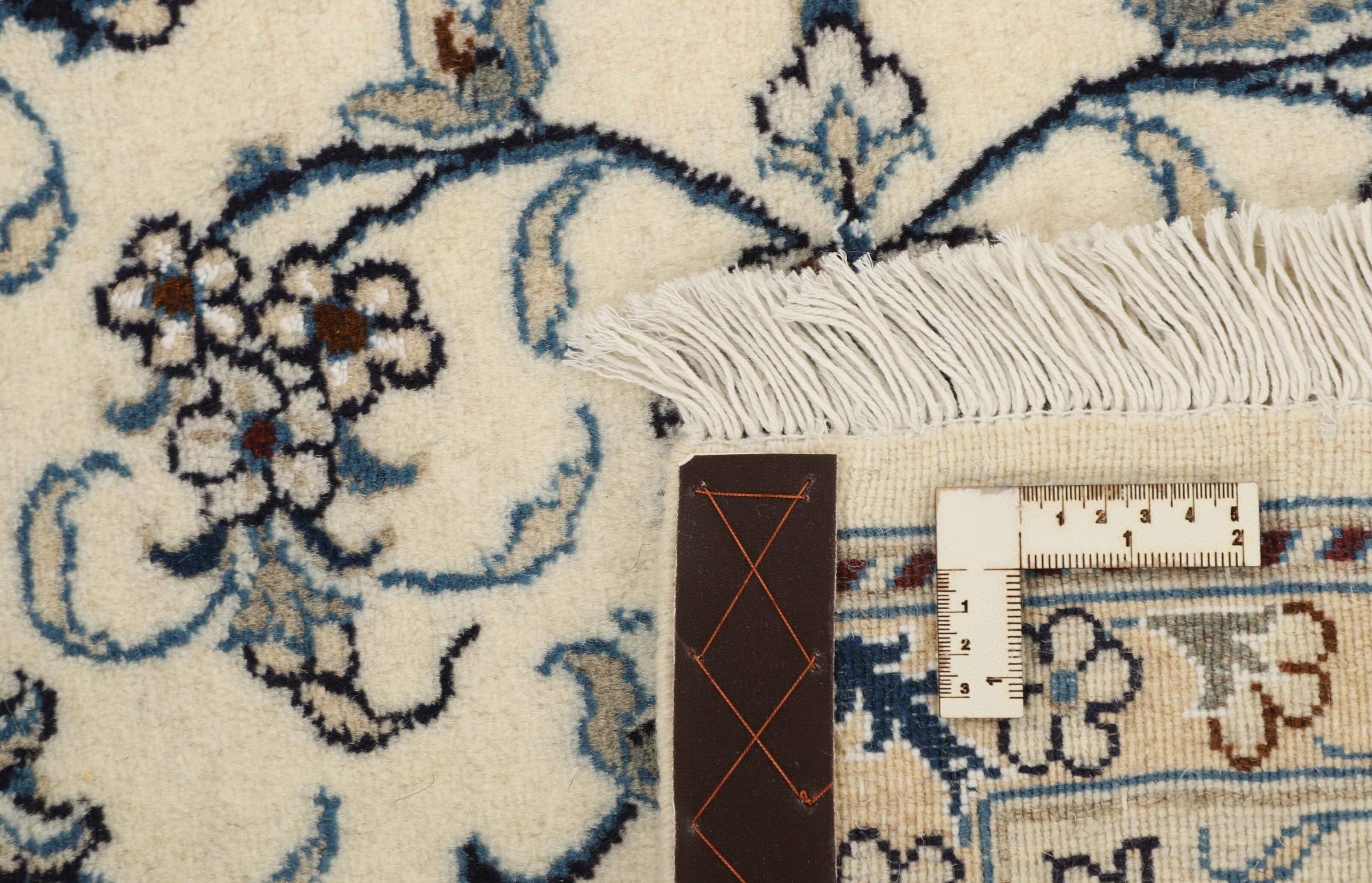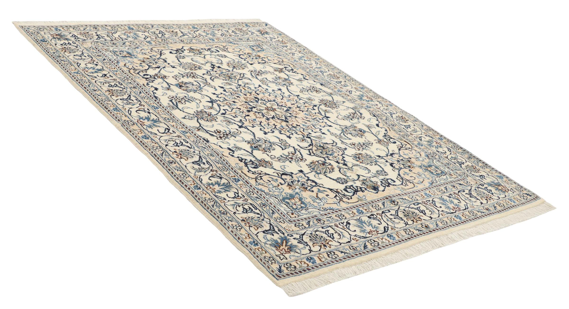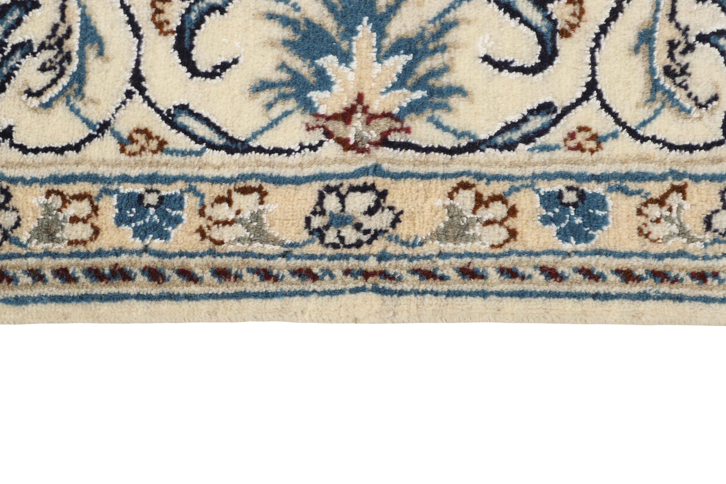 This Nain rug is classified as 12La. Its typical Nain colour scheme gives it an elegant and sophisticated look. This Persian rug was hand-knotted in the city of Nain, which lies on the western edge of the Dasht-e-Kavir desert, using high-quality wool and natural silk. At 12La, it is not as finely detailed with ornamentation as a Nain 9La or 6La.