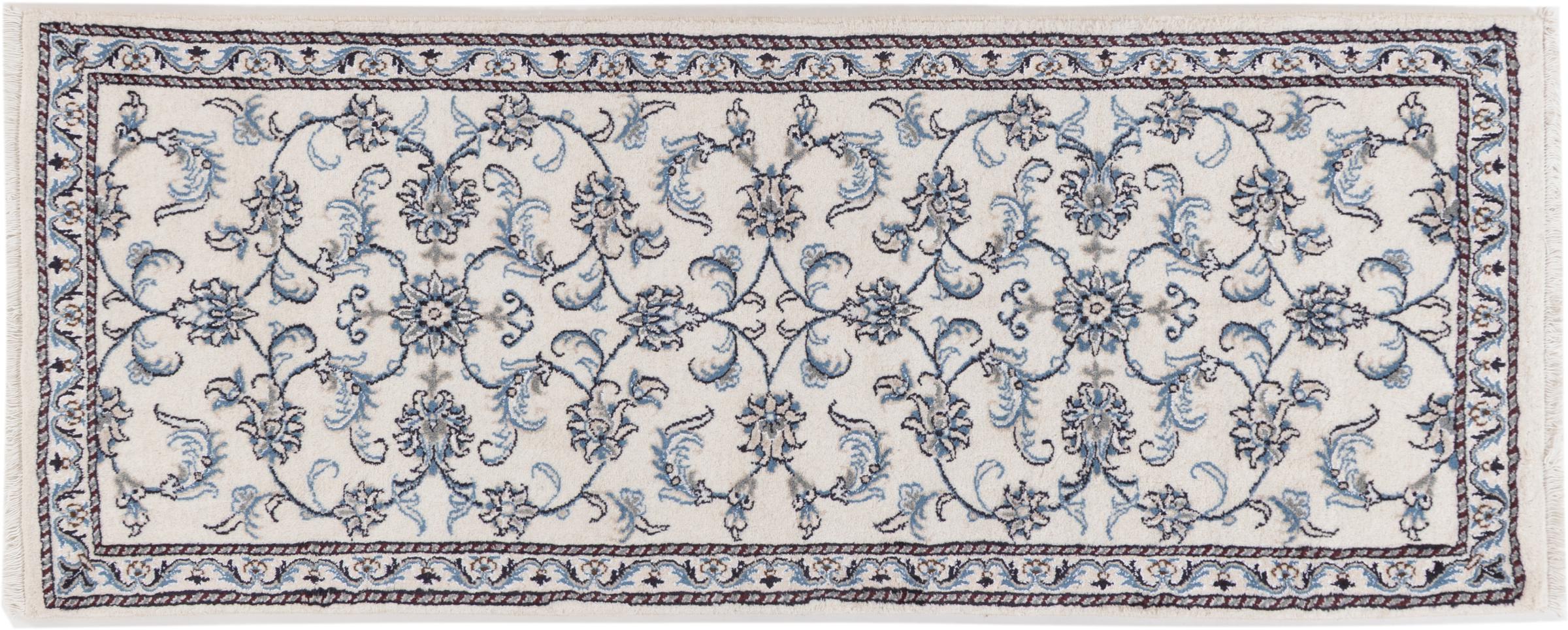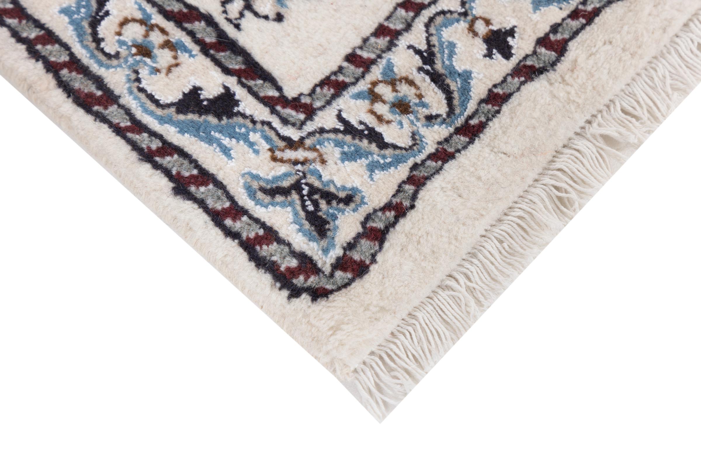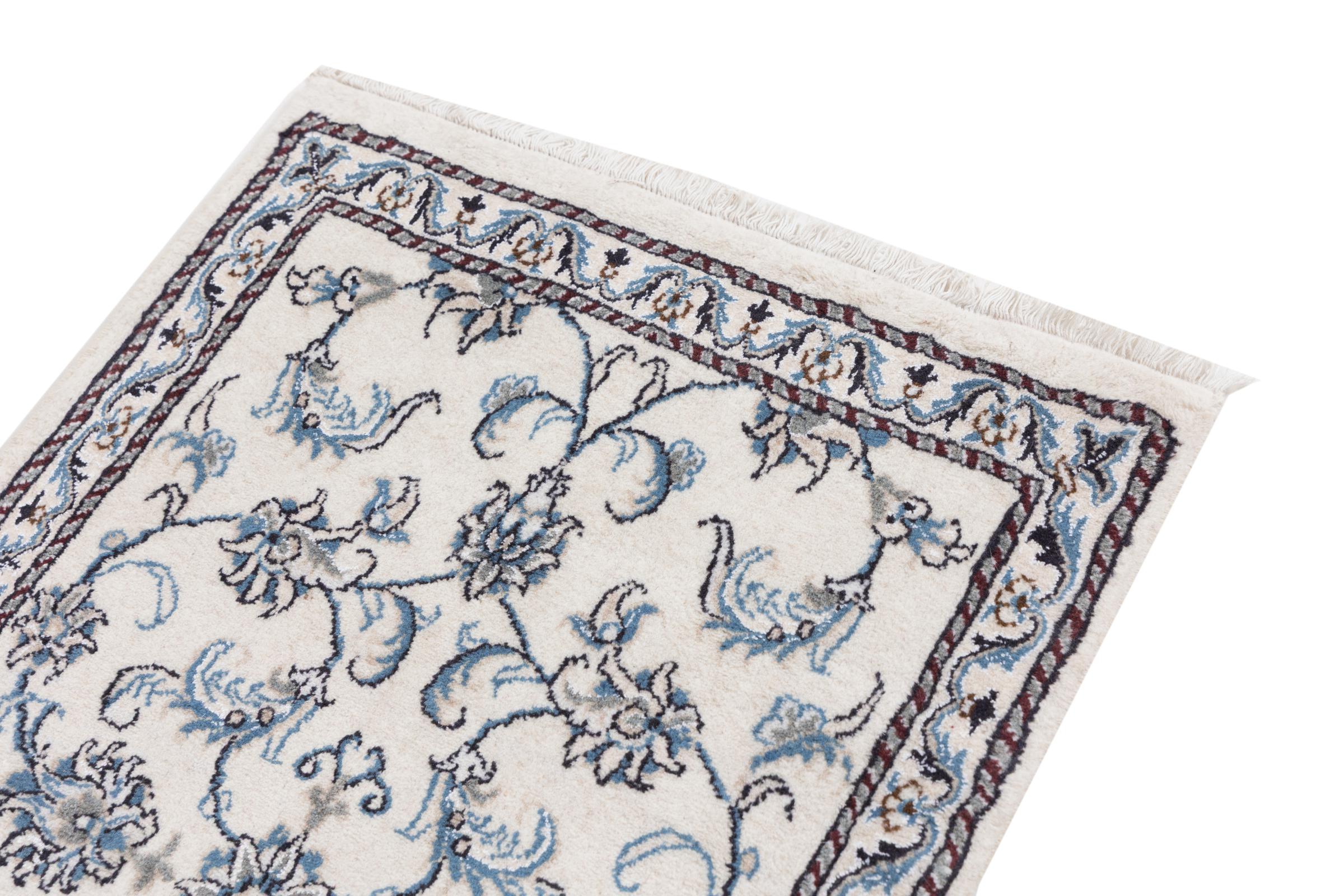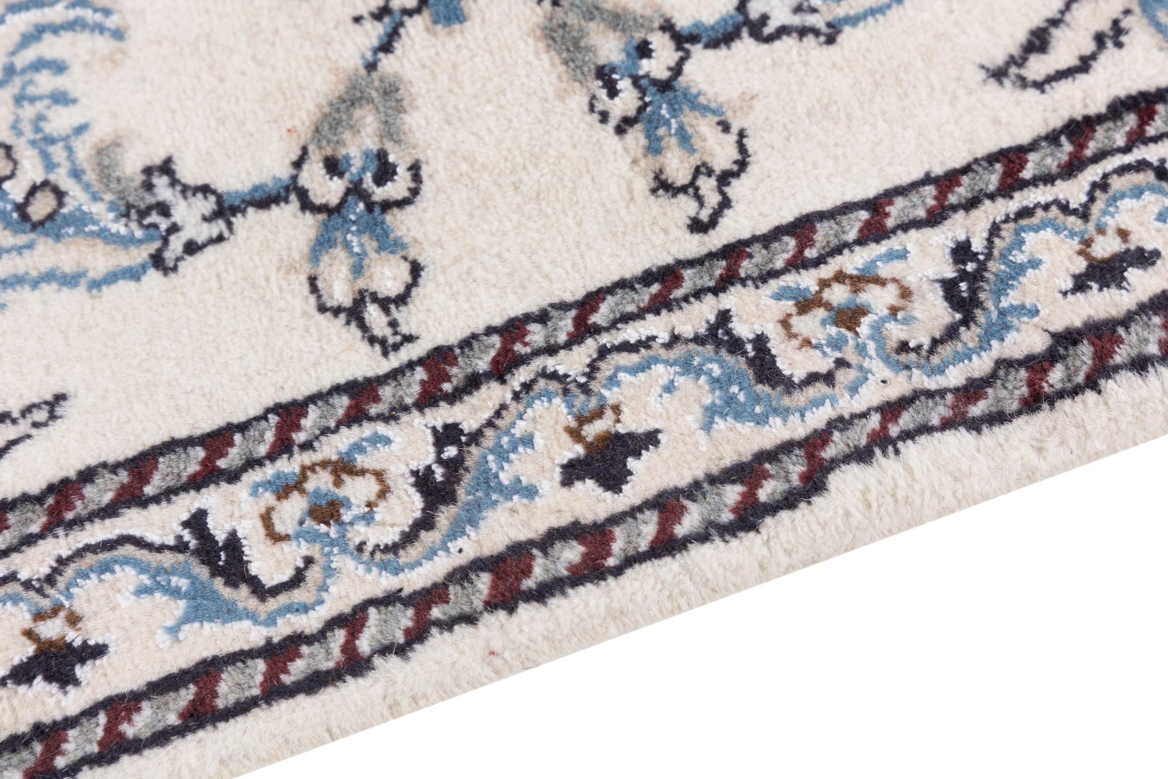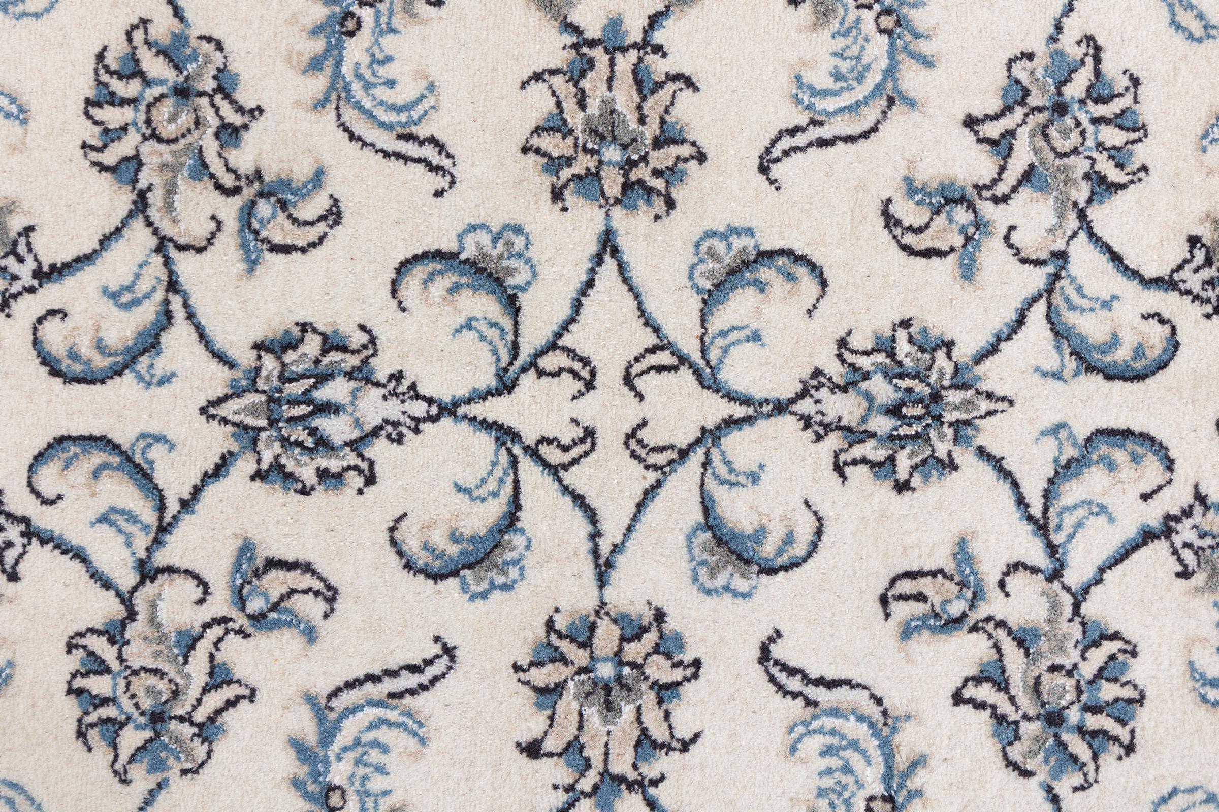 This Nain rug is classified as 12La. Its typical Nain colour scheme gives it an elegant and sophisticated look. This Persian rug was hand-knotted in the city of Nain, which lies on the western edge of the Dasht-e-Kavir desert, using high-quality wool and natural silk. At 12La, it is not as finely detailed with ornamentation as a Nain 9La or 6La.