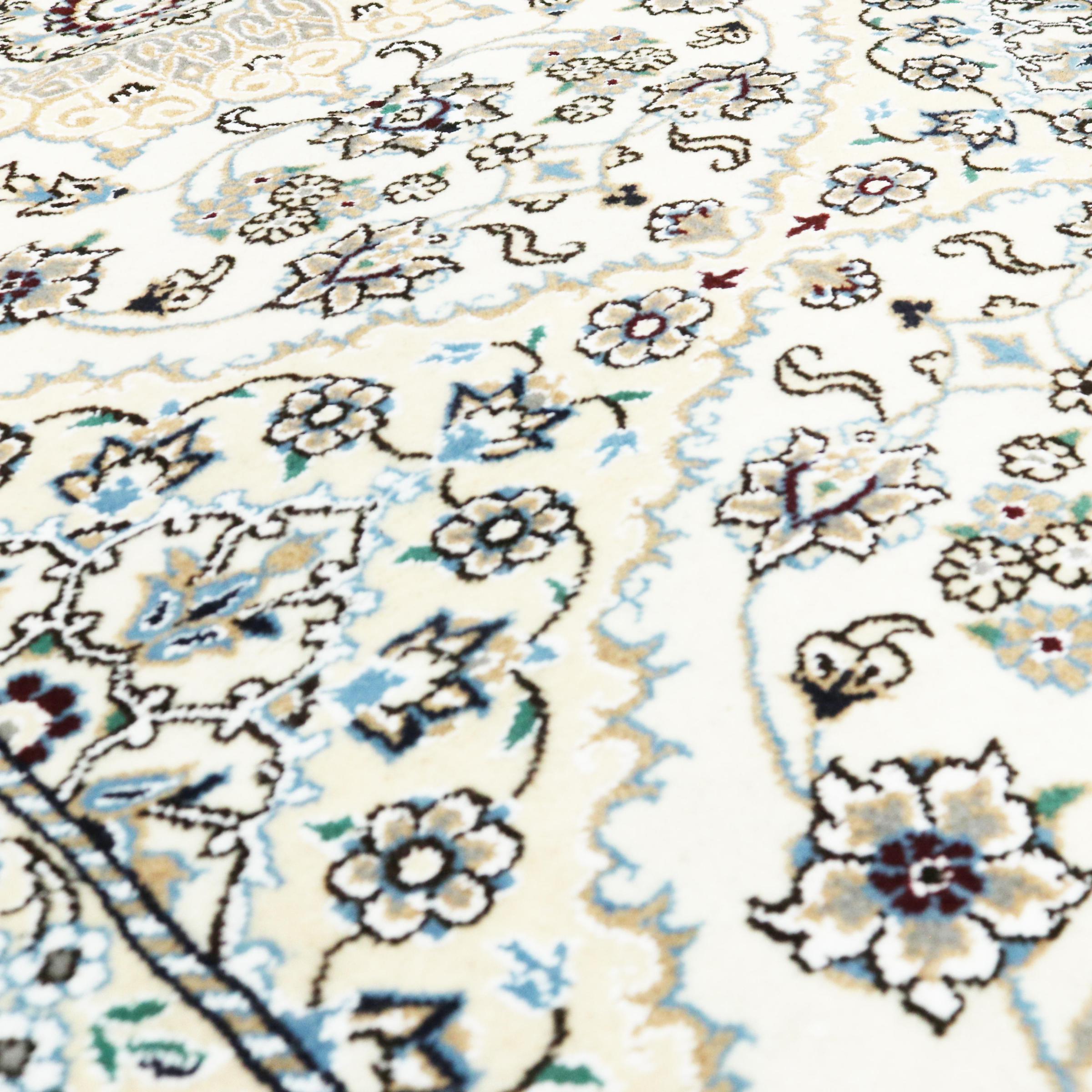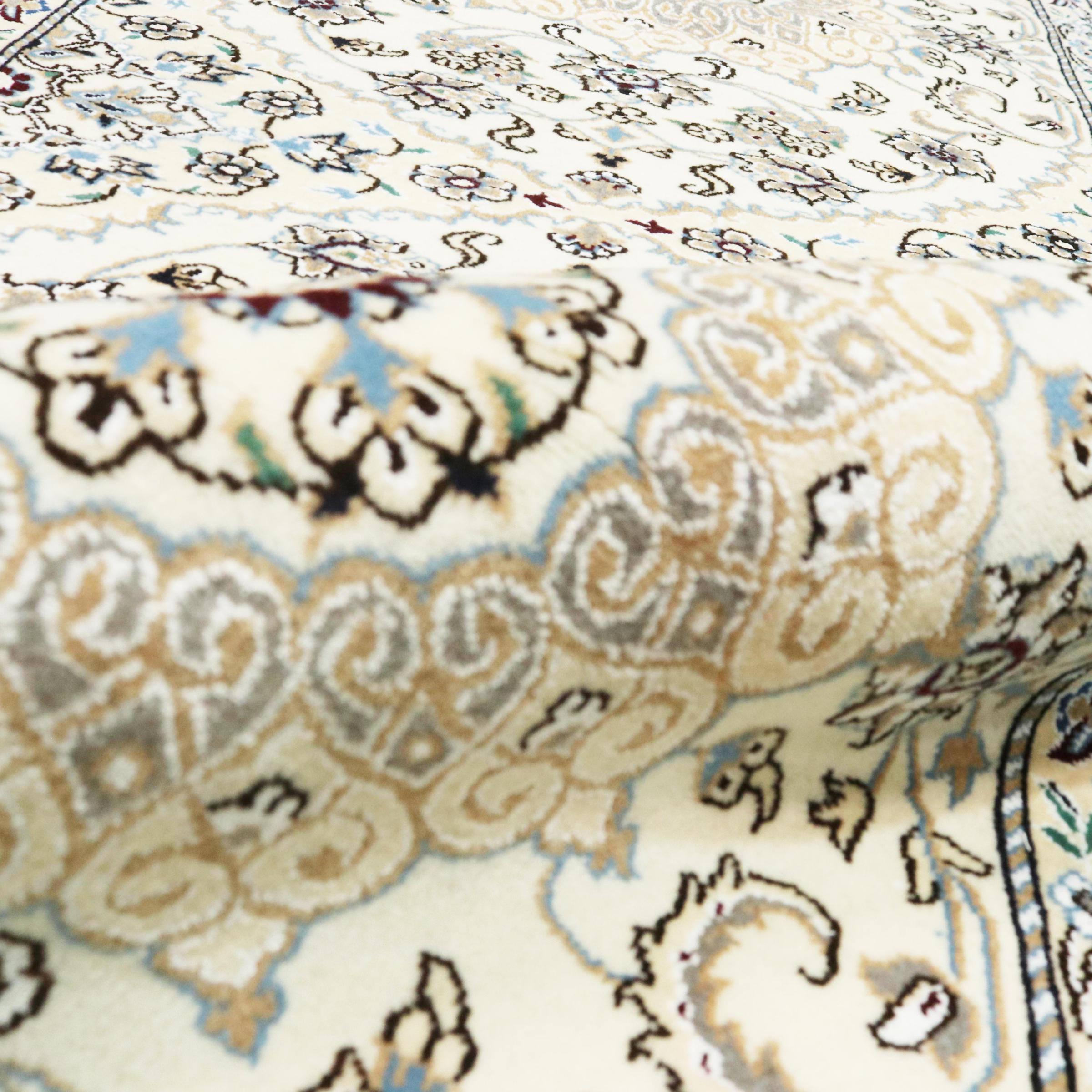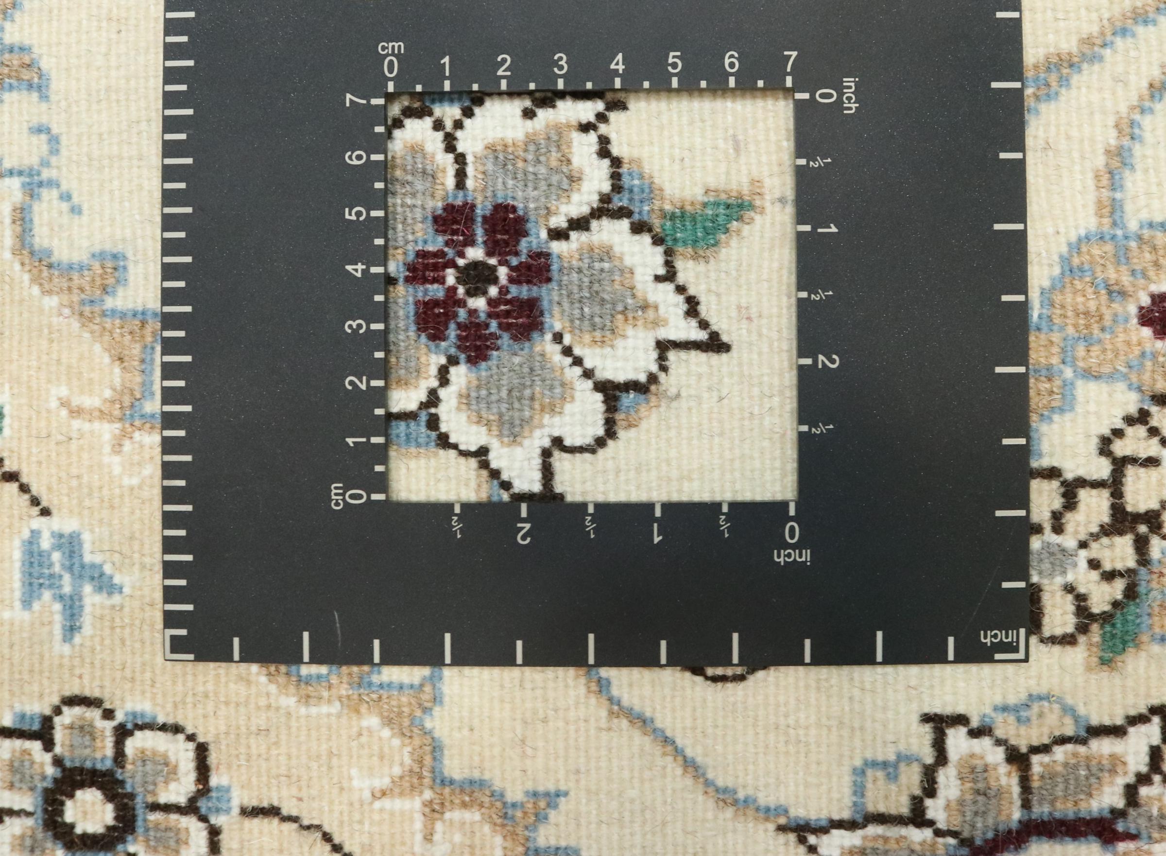 This Nain rug is classified as 9La. The excellent quality, the beautiful oriental design with its curvilinear patterns will delight every buyer. This Persian rug was hand-knotted in the city of Nain, which lies on the western edge of the Dasht-e-Kavir desert, from high-quality wool and natural silk. 9La Nain rugs are significantly finer than a 12La and already show beautiful details.