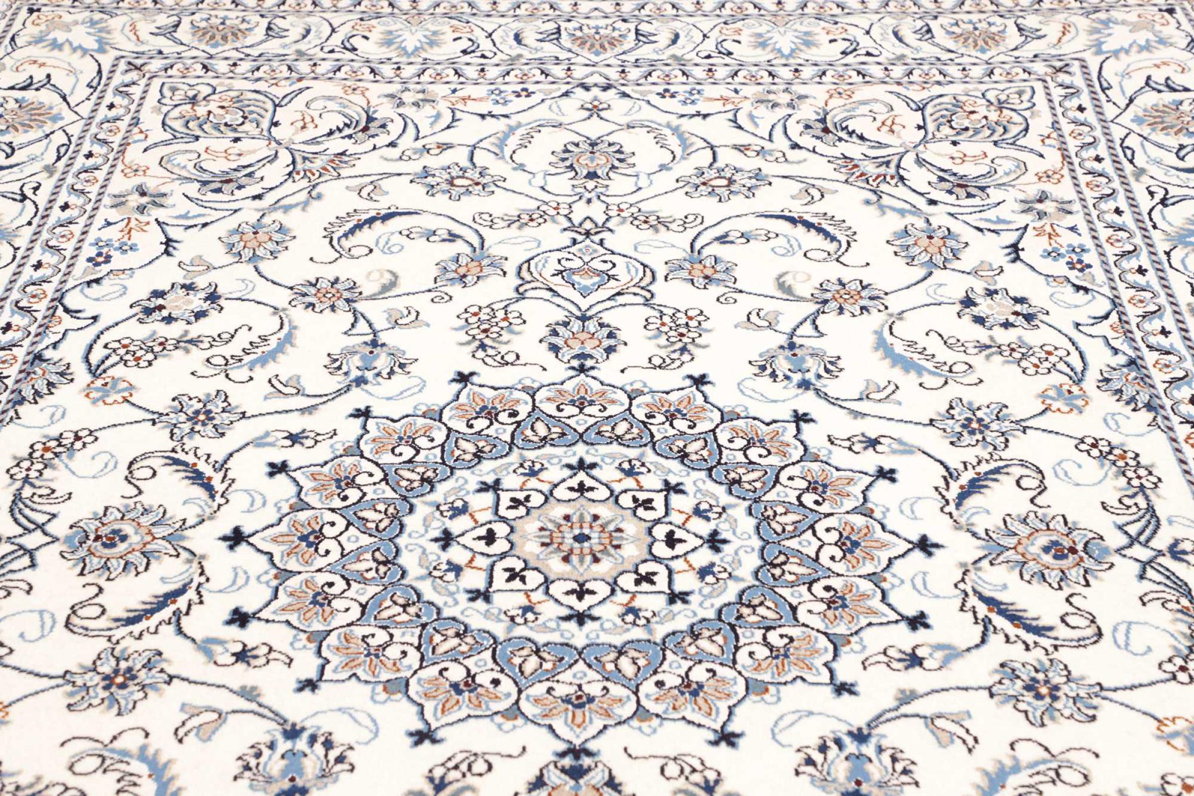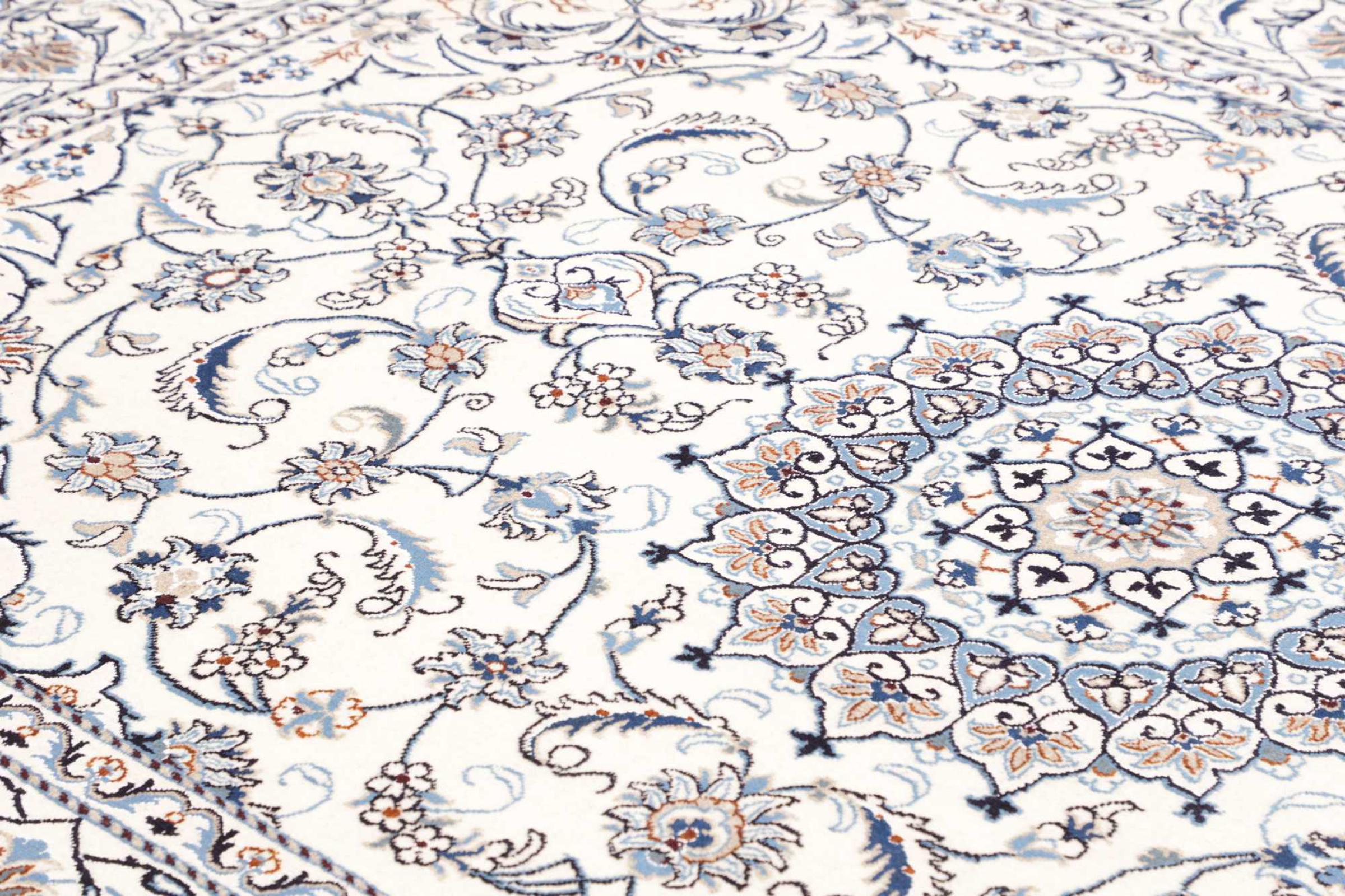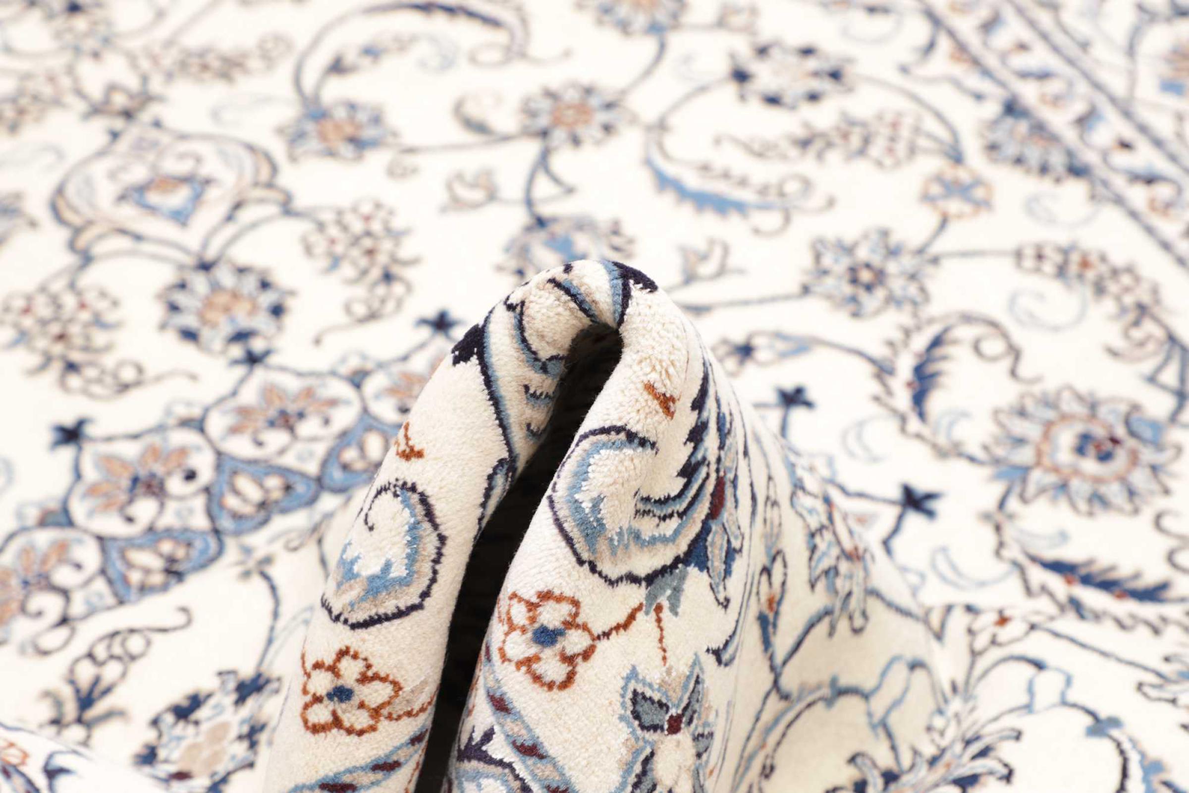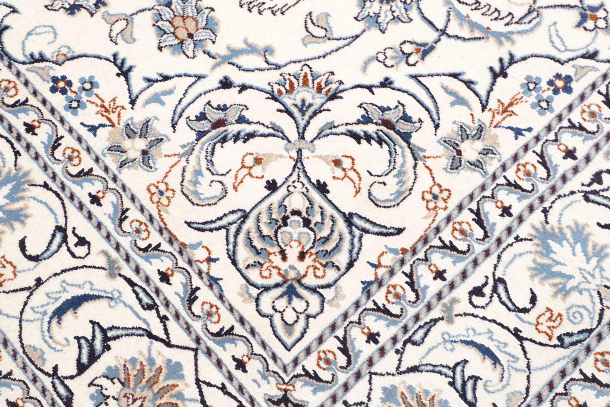 This Nain rug is classified as 12La. Its typical Nain colour scheme gives it an elegant and sophisticated look. This Persian rug was hand-knotted in the city of Nain, which lies on the western edge of the Dasht-e-Kavir desert, using high-quality wool and natural silk. At 12La, it is not as finely detailed with ornamentation as a Nain 9La or 6La.