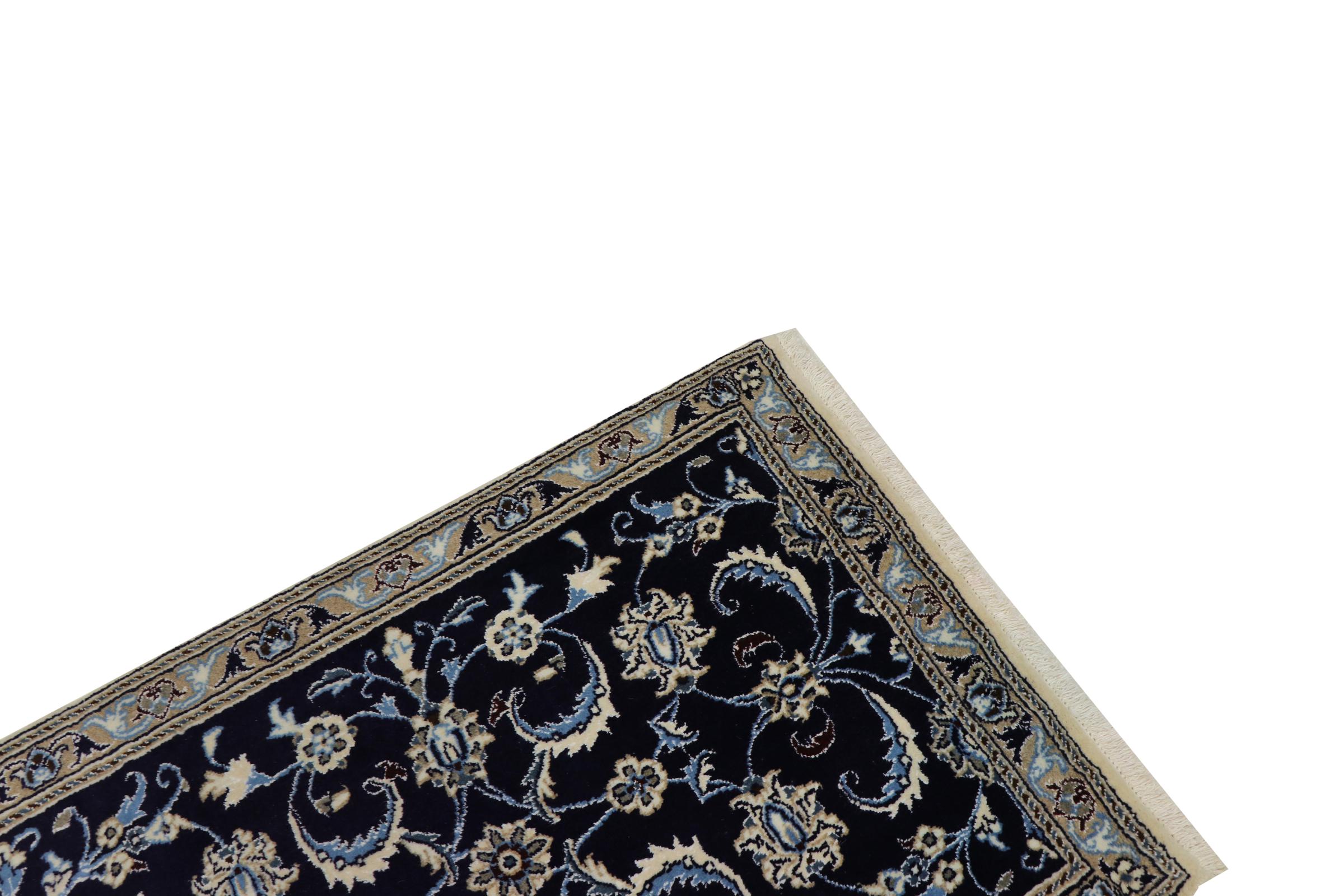 This Nain rug is classified as 12La. Its typical Nain colour scheme gives it an elegant and sophisticated look. This Persian rug was hand-knotted in the city of Nain, which lies on the western edge of the Dasht-e-Kavir desert, using high-quality wool and natural silk. At 12La, it is not as finely detailed with ornamentation as a Nain 9La or 6La.