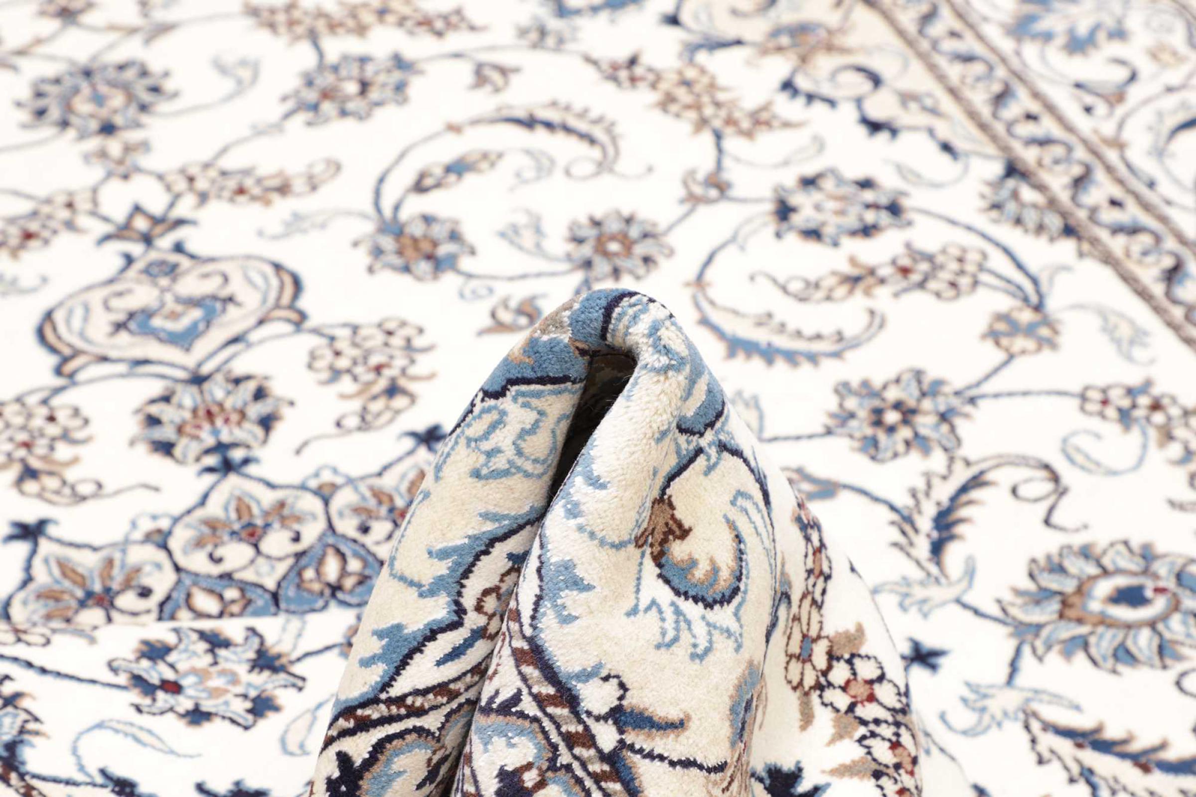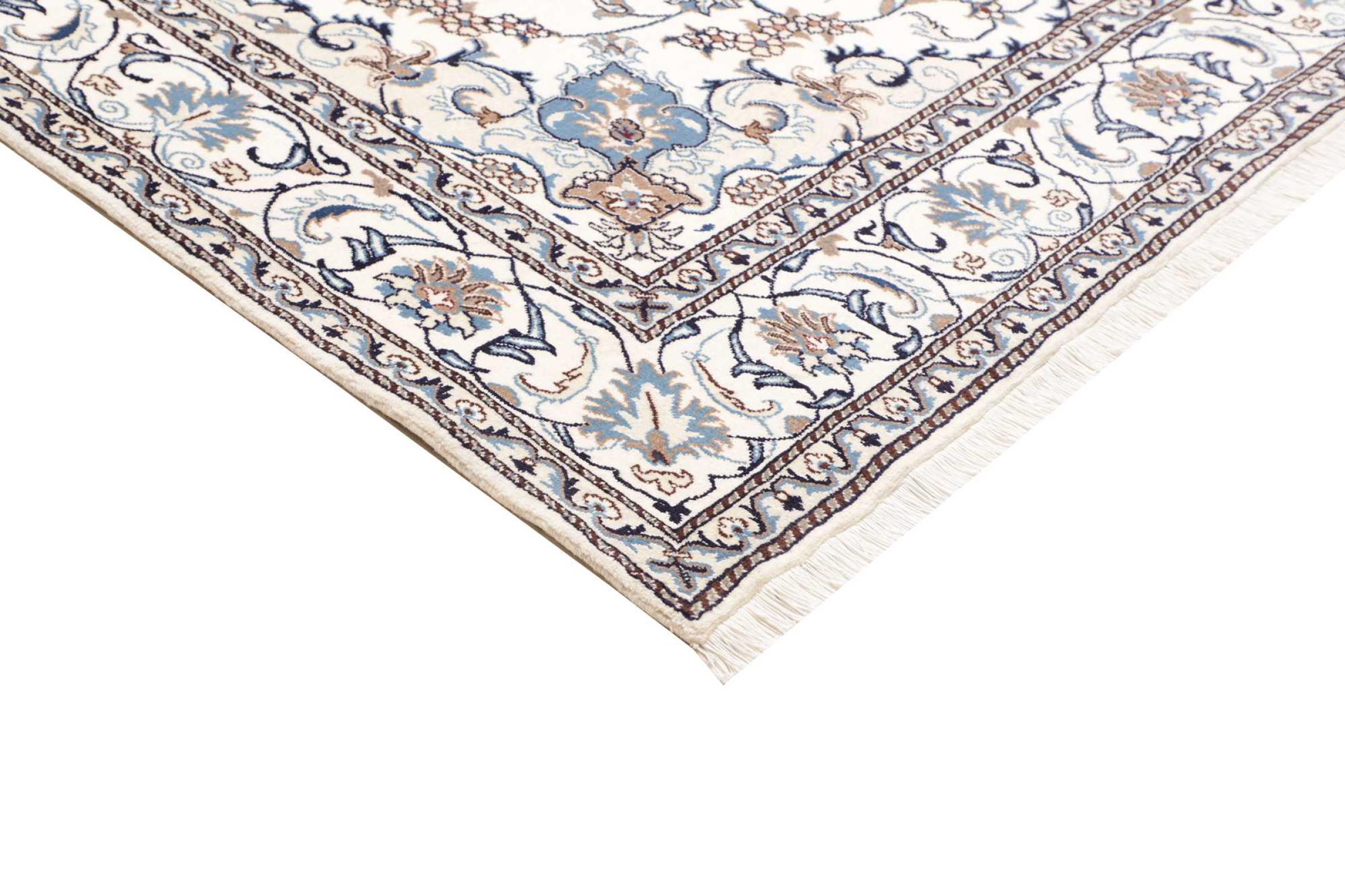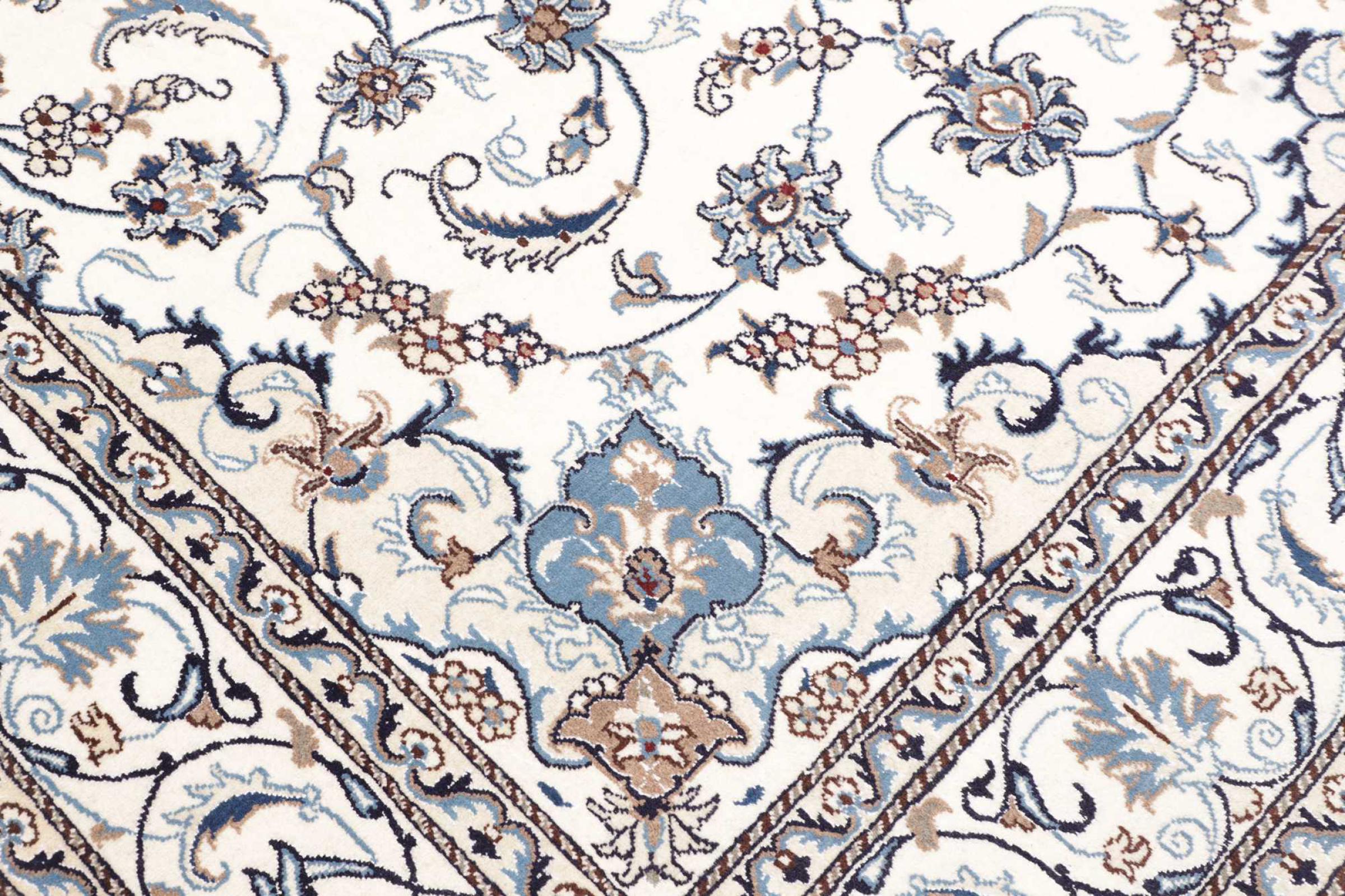This Nain rug is classified as 12La. Its typical Nain colour scheme gives it an elegant and sophisticated look. This Persian rug was hand-knotted in the city of Nain, which lies on the western edge of the Dasht-e-Kavir desert, using high-quality wool and natural silk. At 12La, it is not as finely detailed with ornamentation as a Nain 9La or 6La.