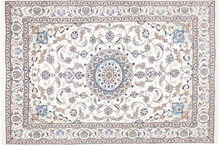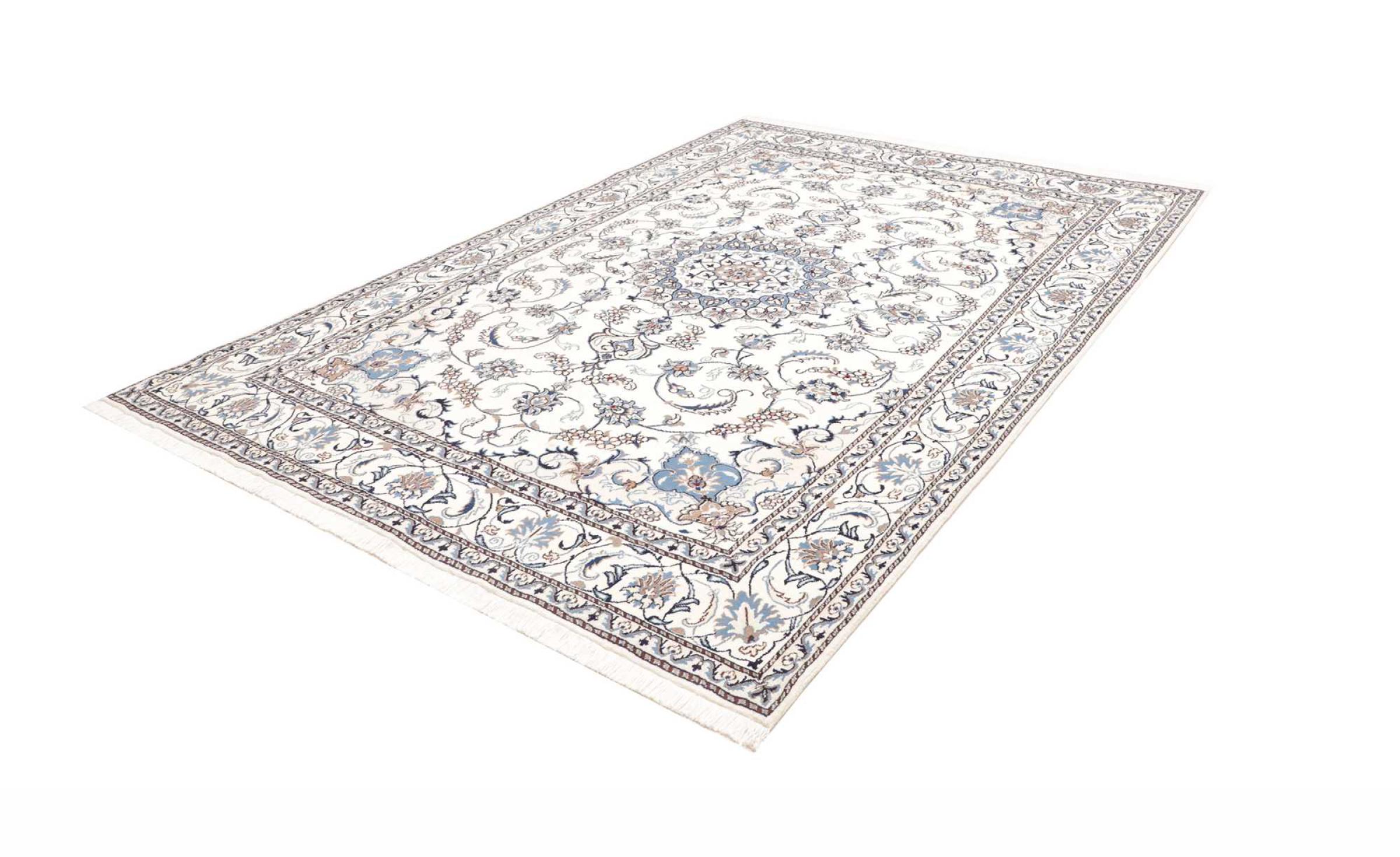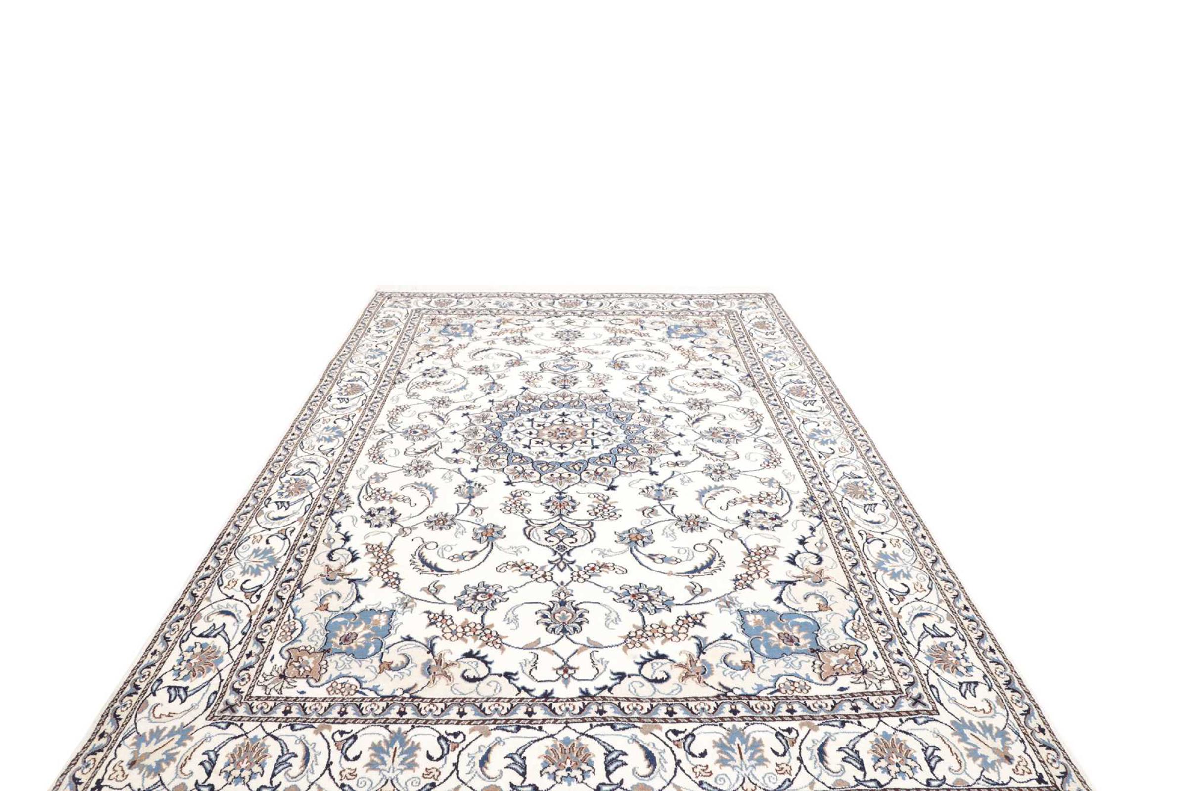 This Nain rug is classified as 12La. Its typical Nain colour scheme gives it an elegant and sophisticated look. This Persian rug was hand-knotted in the city of Nain, which lies on the western edge of the Dasht-e-Kavir desert, using high-quality wool and natural silk. At 12La, it is not as finely detailed with ornamentation as a Nain 9La or 6La.