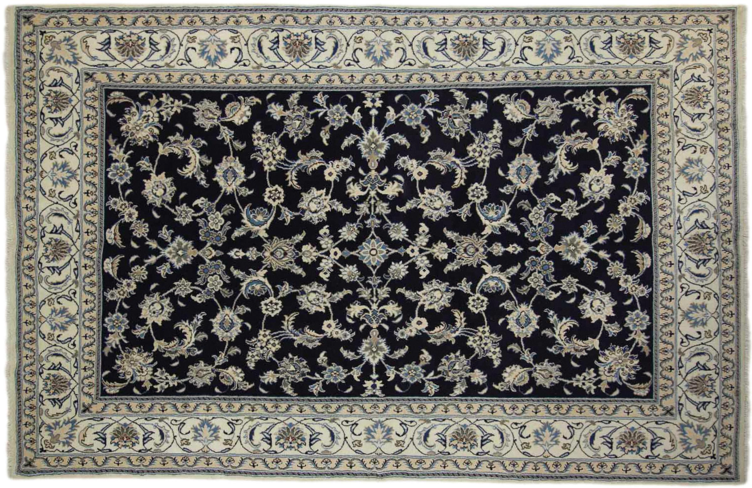 This Nain rug is classified as 12La. Its typical Nain colour scheme gives it an elegant and sophisticated look. This Persian rug was hand-knotted in the city of Nain, which lies on the western edge of the Dasht-e-Kavir desert, using high-quality wool and natural silk. At 12La, it is not as finely detailed with ornamentation as a Nain 9La or 6La.