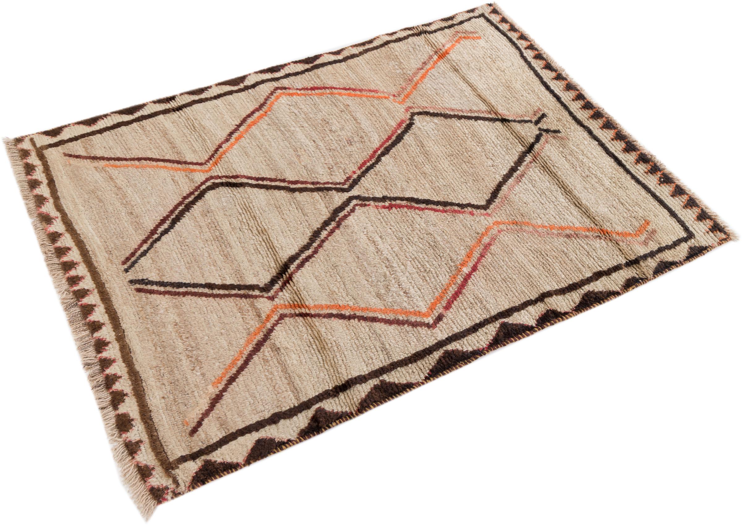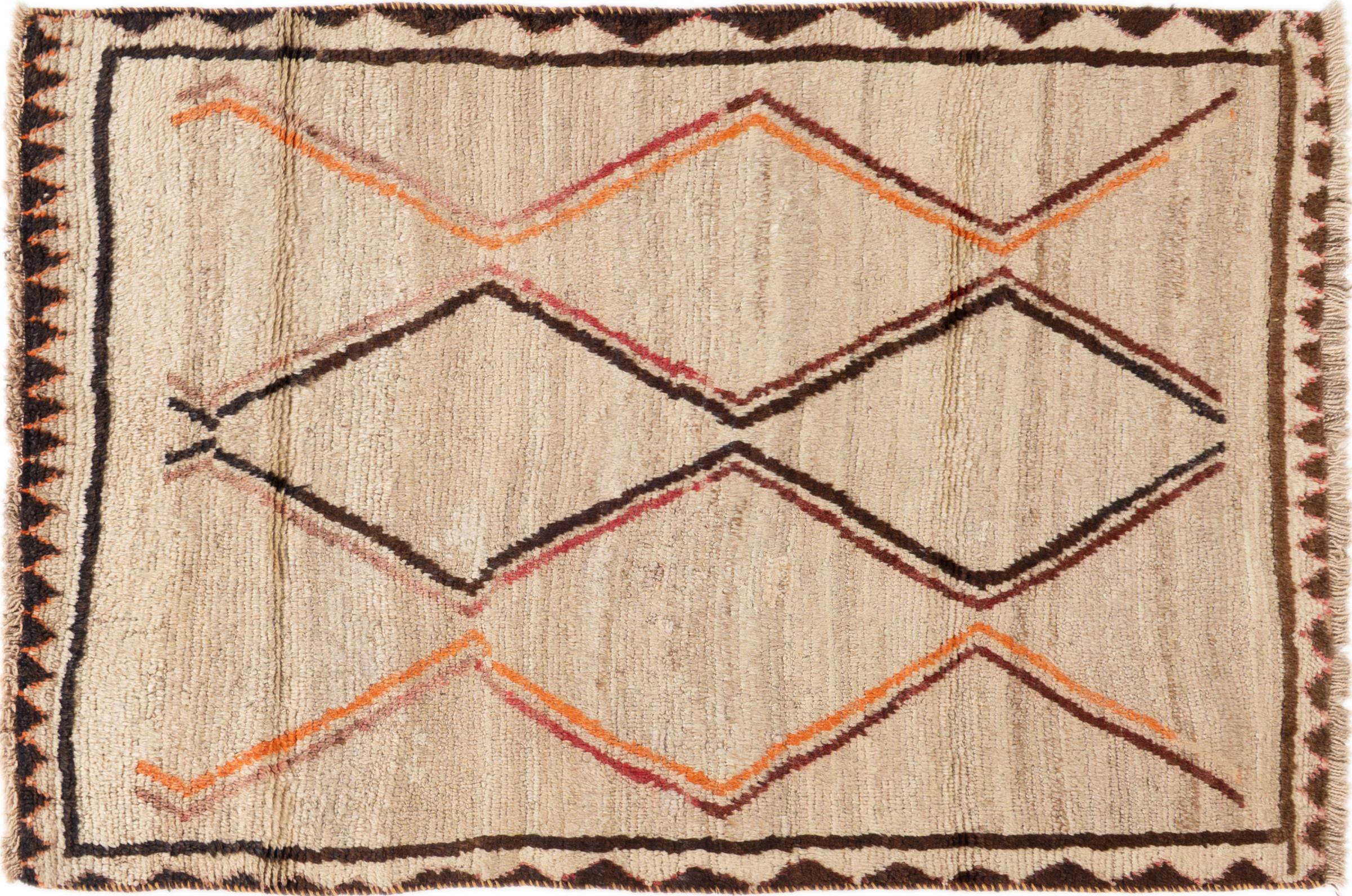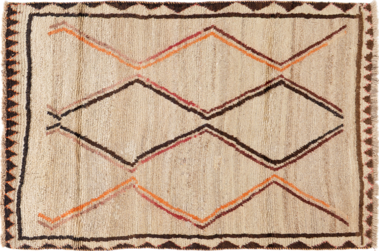 This beautiful rug is a Persian Gabbeh and thus belongs to the highest quality Gabbeh rugs. The rugs are knotted by nomads or semi-nomads in Iran following traditional handicraft. The simple motifs and patterns are mostly inspired by the nomads' close environment. For example camels, trees or bushes can be found on the traditional rugs. Persian Gabbeh rugs are made of wool from locally raised flocks of sheep. The wool is therefore mostly still spun by hand. Thus each of these oriental rugs embodies a unique character of centuries-old culture.
