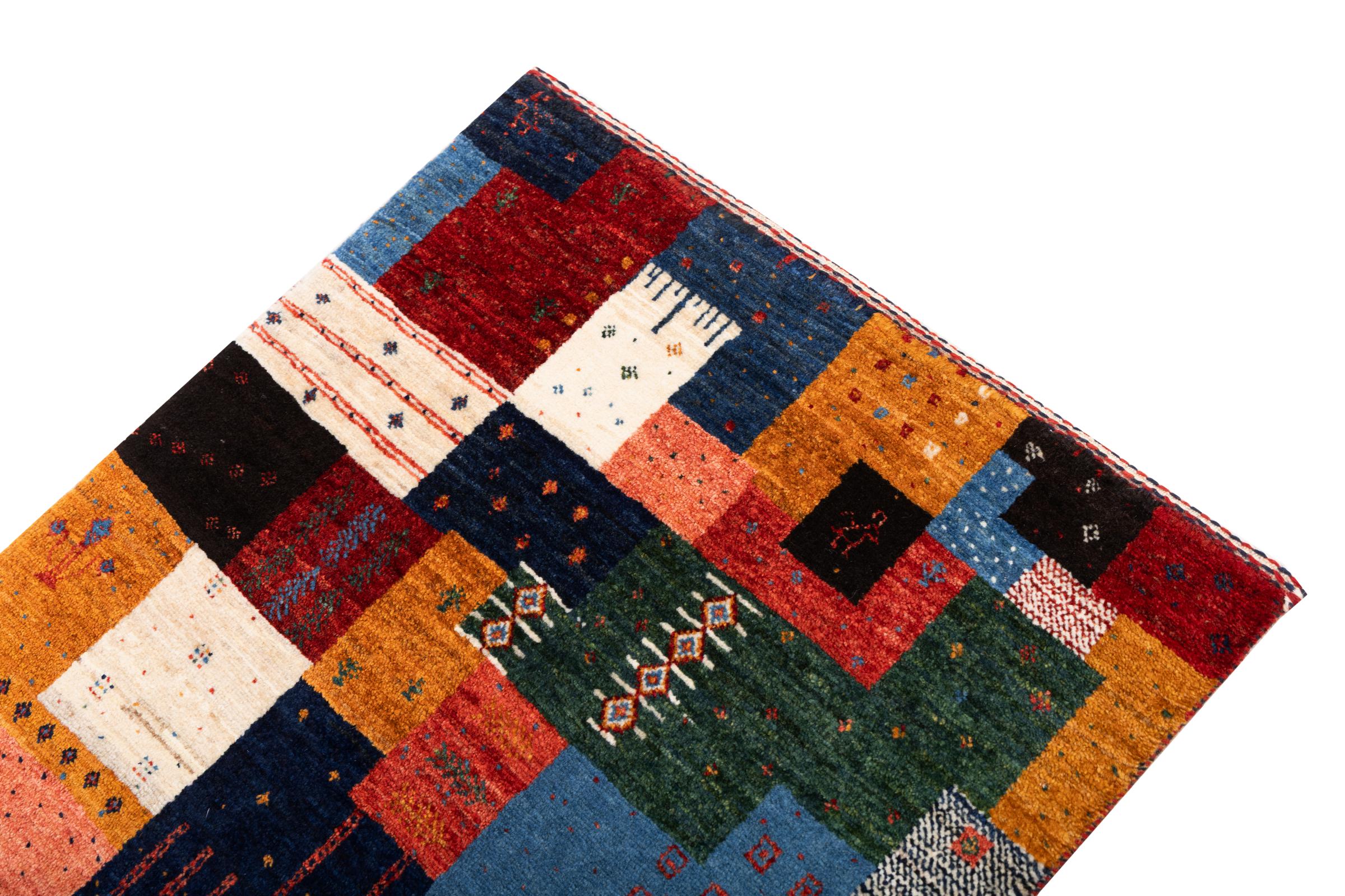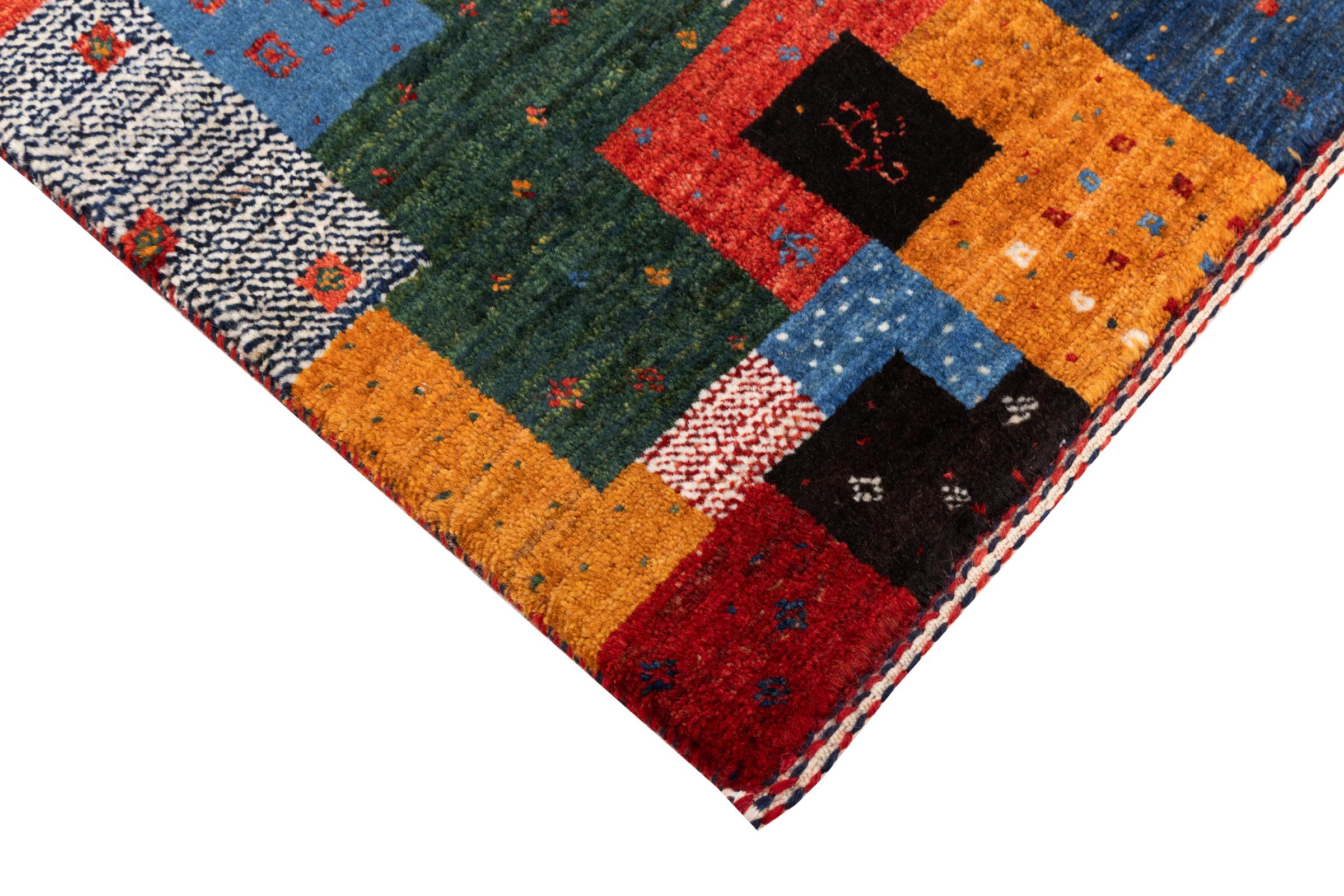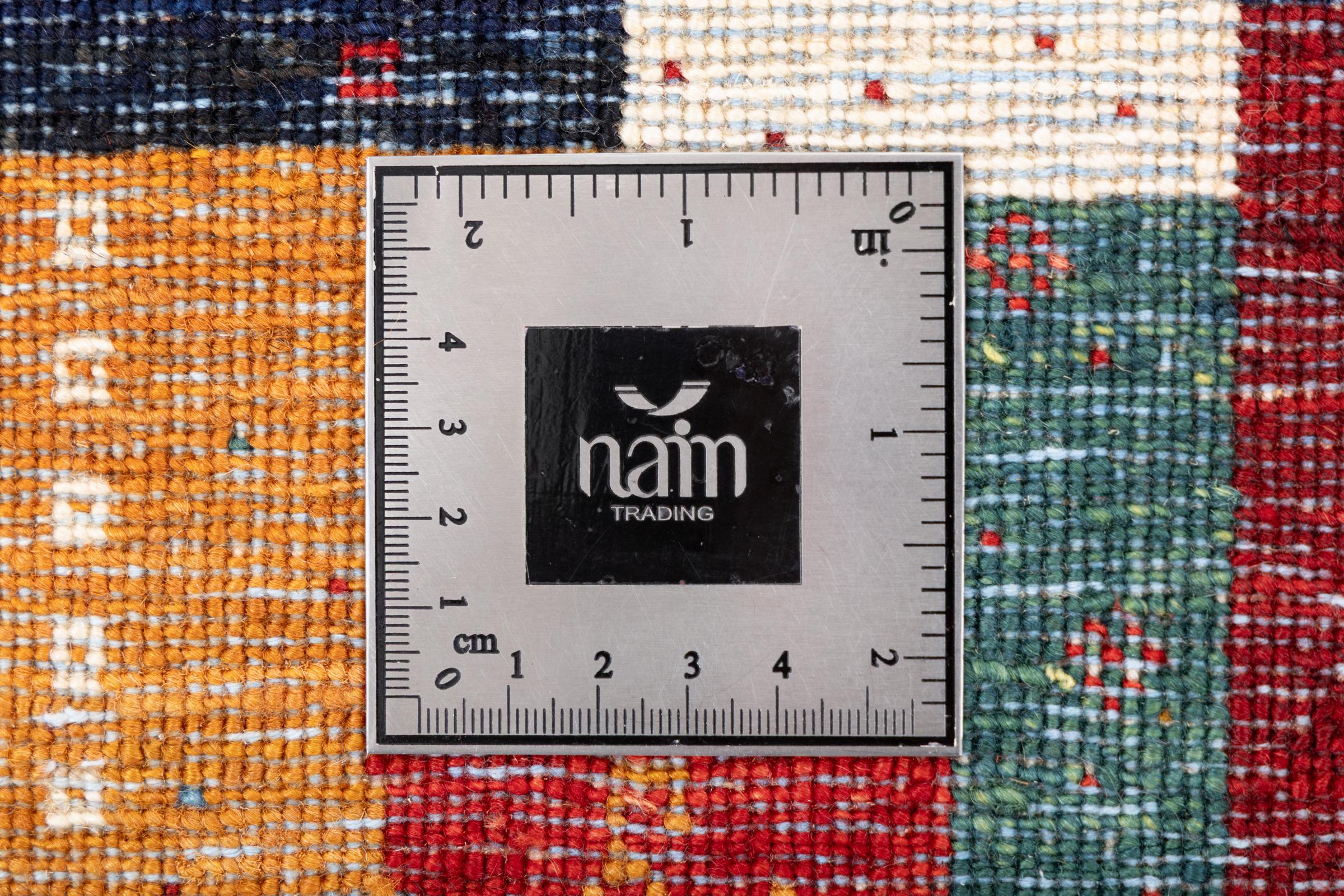 This beautiful rug is a Persian Gabbeh and thus belongs to the highest quality Gabbeh rugs. The rugs are knotted by nomads or semi-nomads in Iran following traditional handicraft. The simple motifs and patterns are mostly inspired by the nomads' close environment. For example camels, trees or bushes can be found on the traditional rugs. Persian Gabbeh rugs are made of wool from locally raised flocks of sheep. The wool is therefore mostly still spun by hand. Thus each of these oriental rugs embodies a unique character of centuries-old culture.