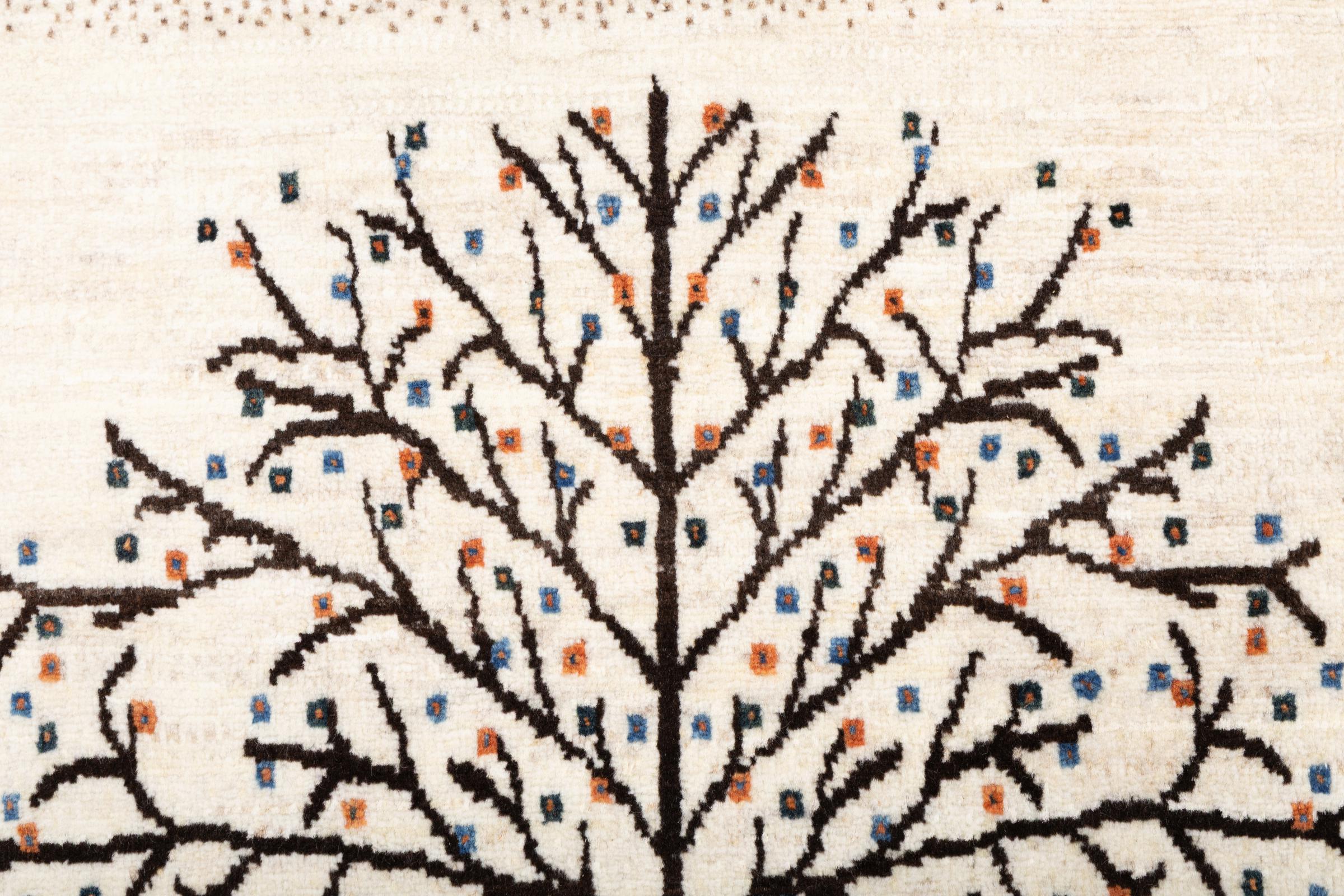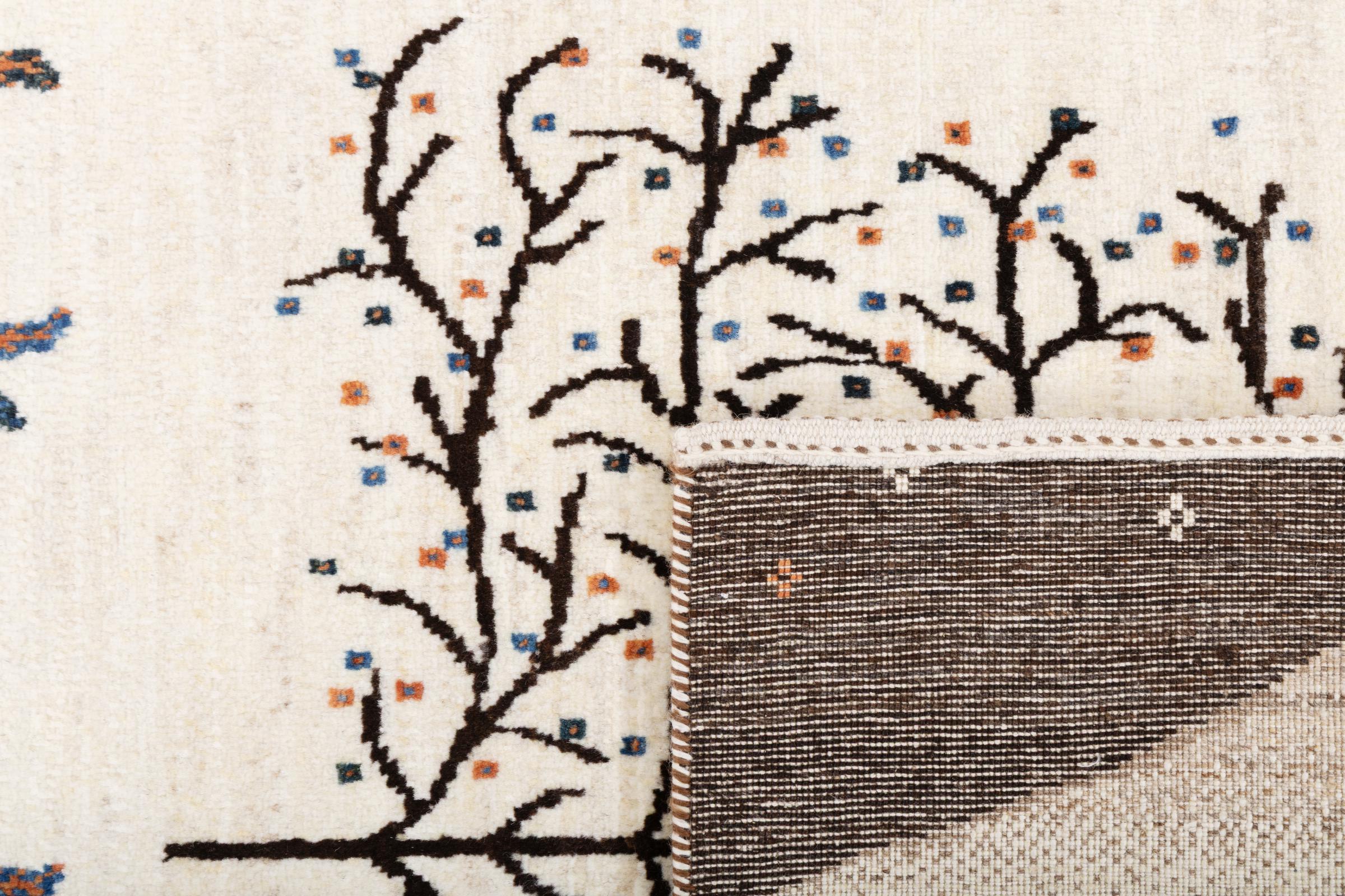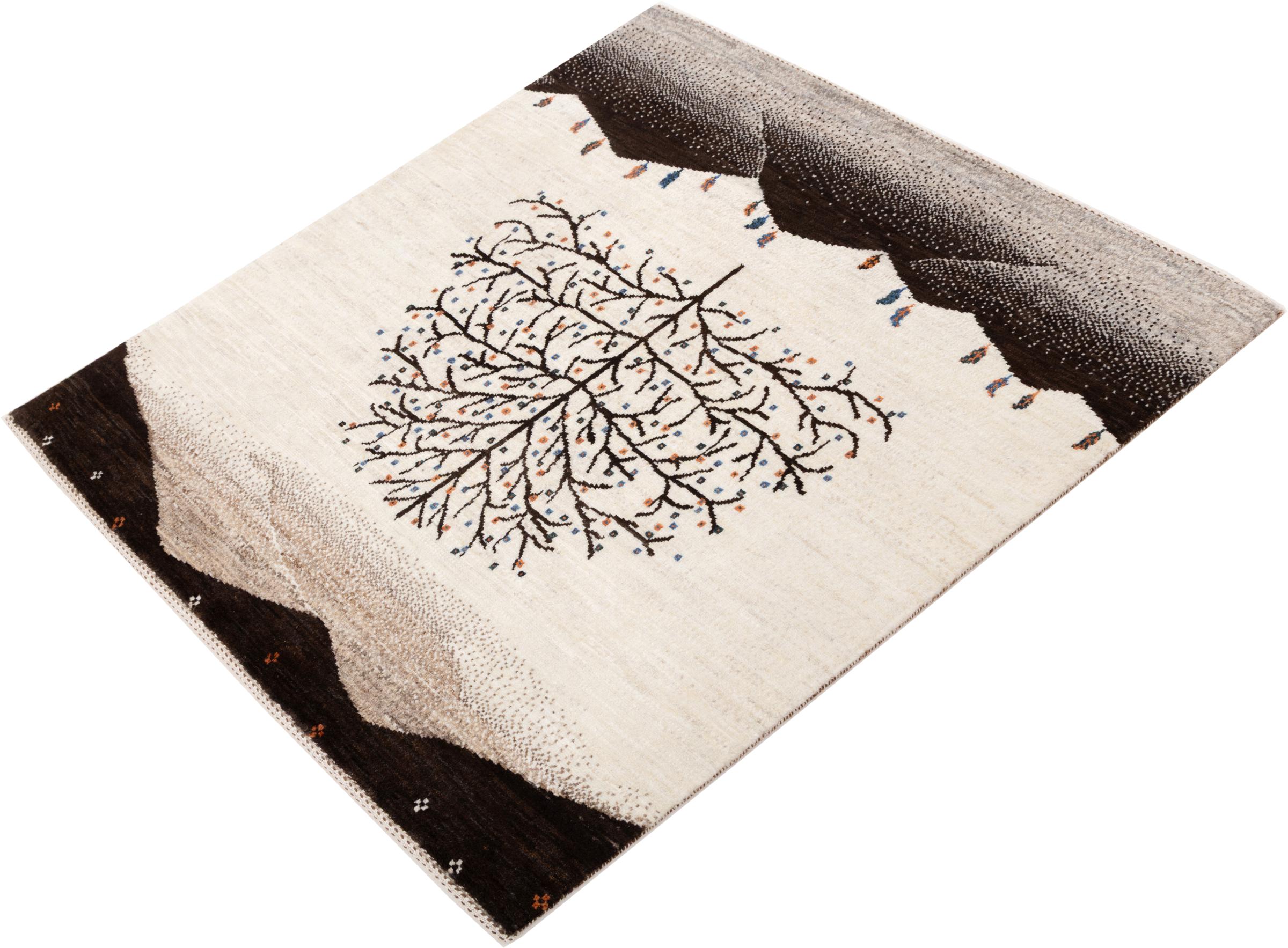 This beautiful rug is a Persian Gabbeh and thus belongs to the highest quality Gabbeh rugs. The rugs are knotted by nomads or semi-nomads in Iran following traditional handicraft. The simple motifs and patterns are mostly inspired by the nomads' close environment. For example camels, trees or bushes can be found on the traditional rugs. Persian Gabbeh rugs are made of wool from locally raised flocks of sheep. The wool is therefore mostly still spun by hand. Thus each of these oriental rugs embodies a unique character of centuries-old culture.