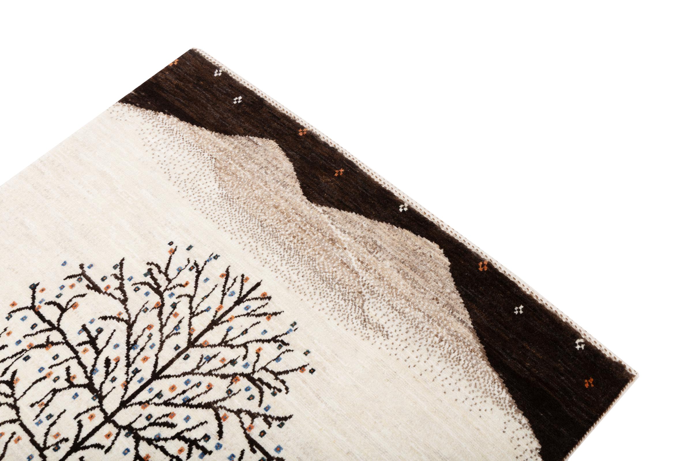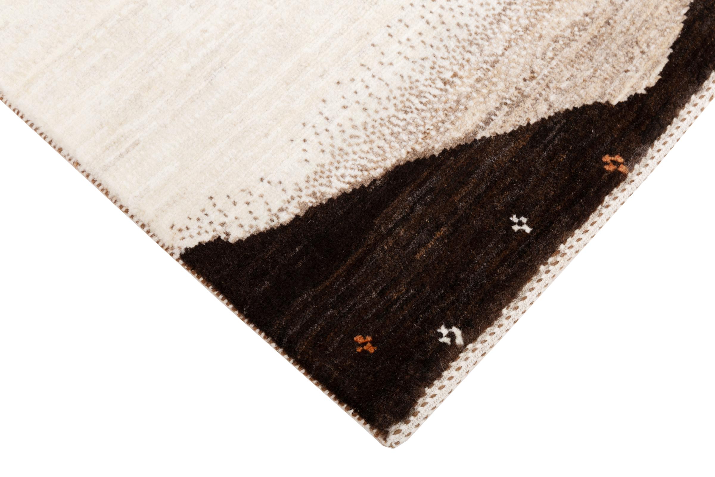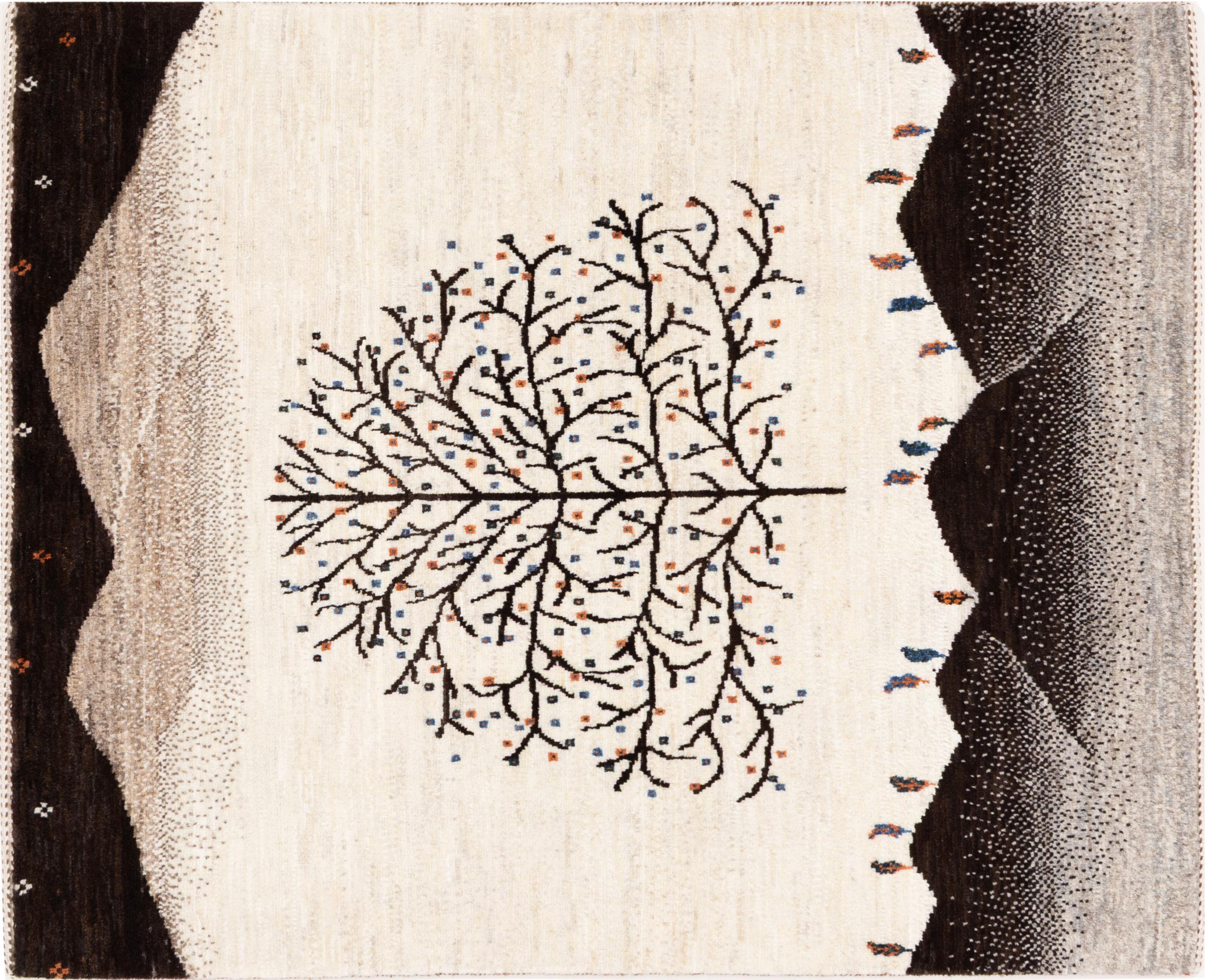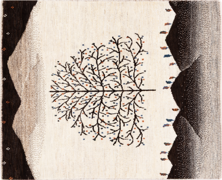 This beautiful rug is a Persian Gabbeh and thus belongs to the highest quality Gabbeh rugs. The rugs are knotted by nomads or semi-nomads in Iran following traditional handicraft. The simple motifs and patterns are mostly inspired by the nomads' close environment. For example camels, trees or bushes can be found on the traditional rugs. Persian Gabbeh rugs are made of wool from locally raised flocks of sheep. The wool is therefore mostly still spun by hand. Thus each of these oriental rugs embodies a unique character of centuries-old culture.