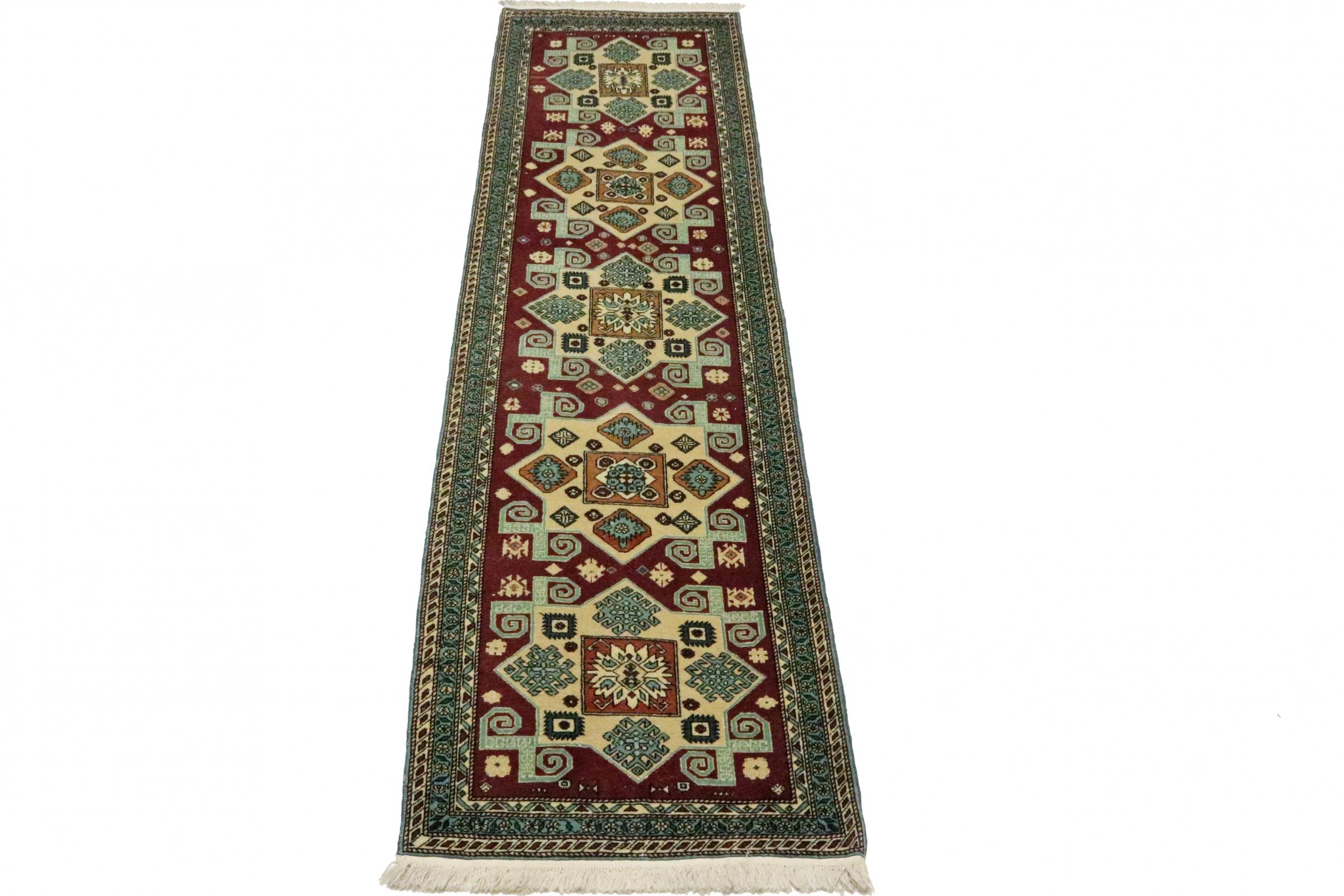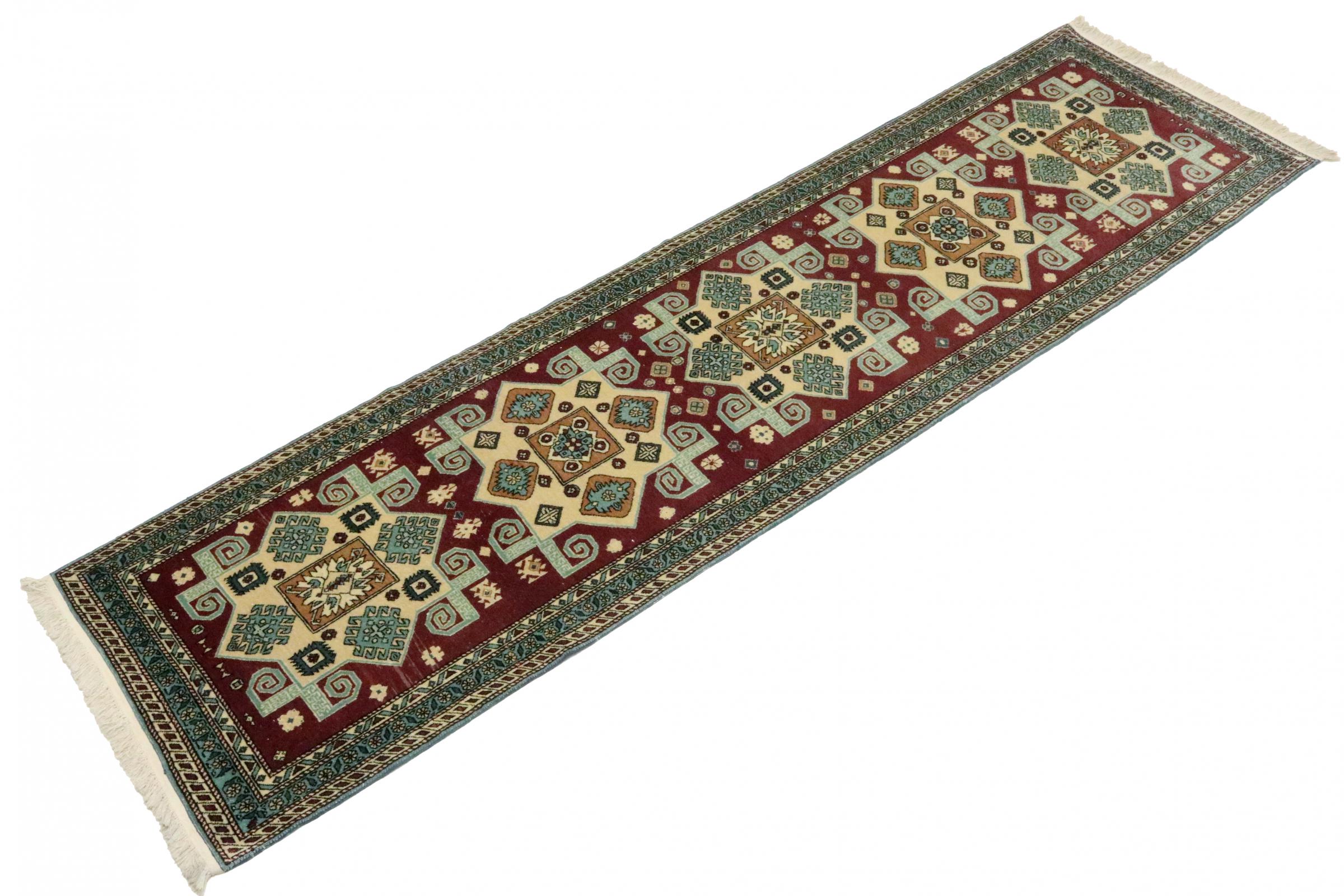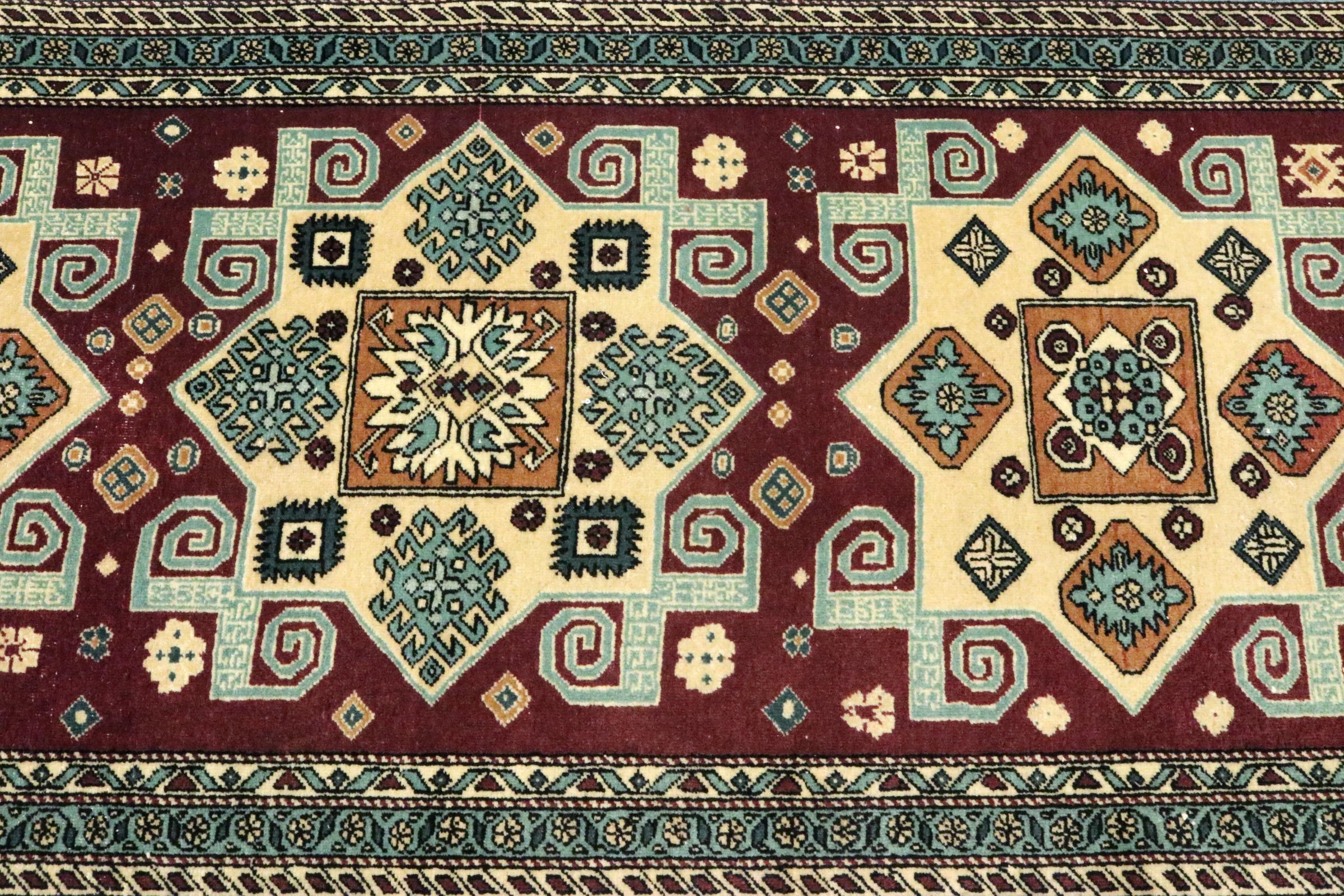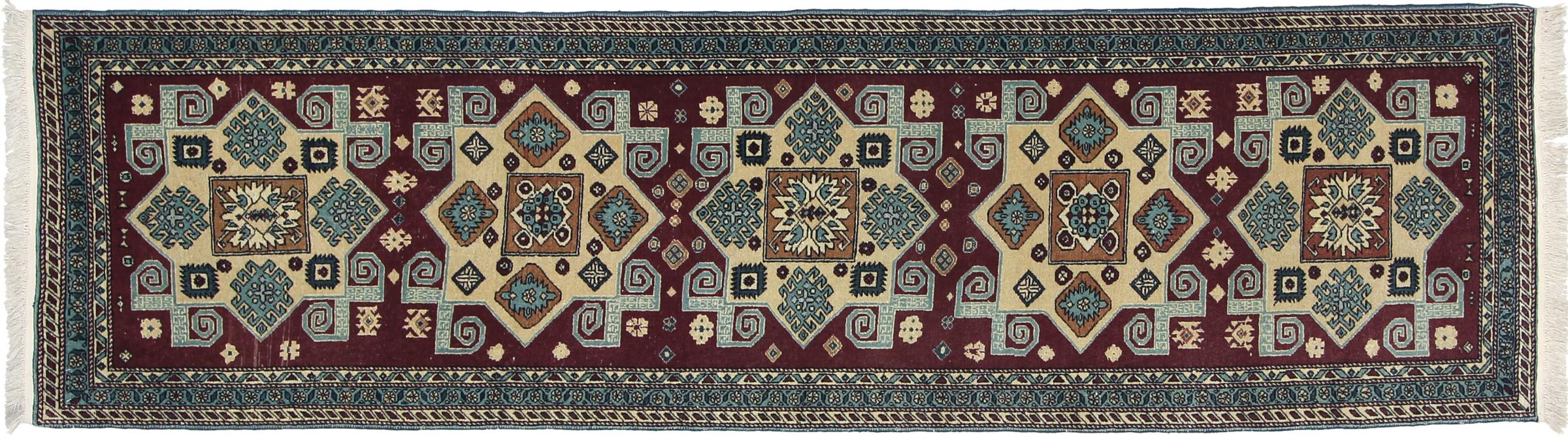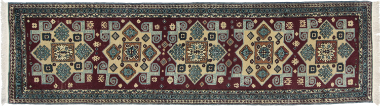 Carpet ID: 111150006842667 Size: 273x71 cm Thickness: ap. 5 mm Knot density: 200 000 - 250 000 / m² Manufacturing: Knotted by hand Pile: Sheep wool Warp: Cotton Origin: Azerbaijan / Russia Age: New Weight: ap. 4 kg In stock: Unique