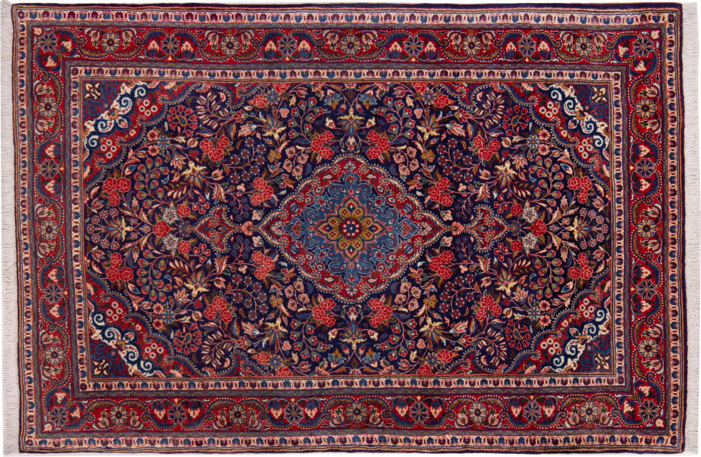 Carpet ID: 292489001853090 Size: 158x106 cm Thickness: ap. 12 mm Knot density: 320 000 - 360 000 / m² Manufacturing: Knotted by hand Pile: Handspun wool Warp: Cotton Origin: Persia Age: New Weight: ap. 6 kg Also know as Arak , Sarough, Sarouk, Saruk, Saroq, Sultanabad In stock: Unique - Only 1 in stock