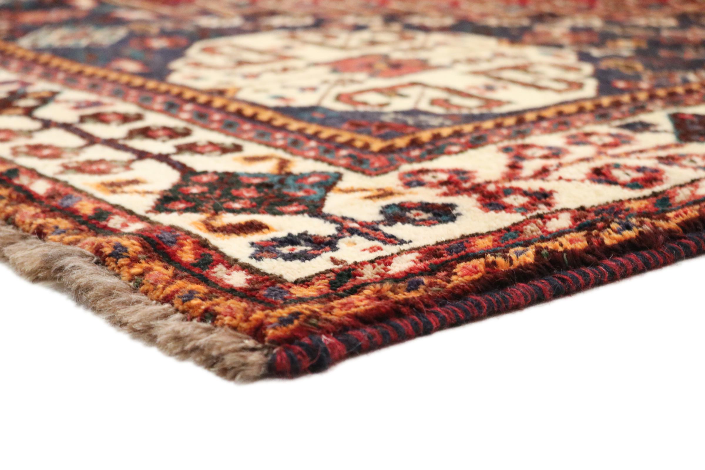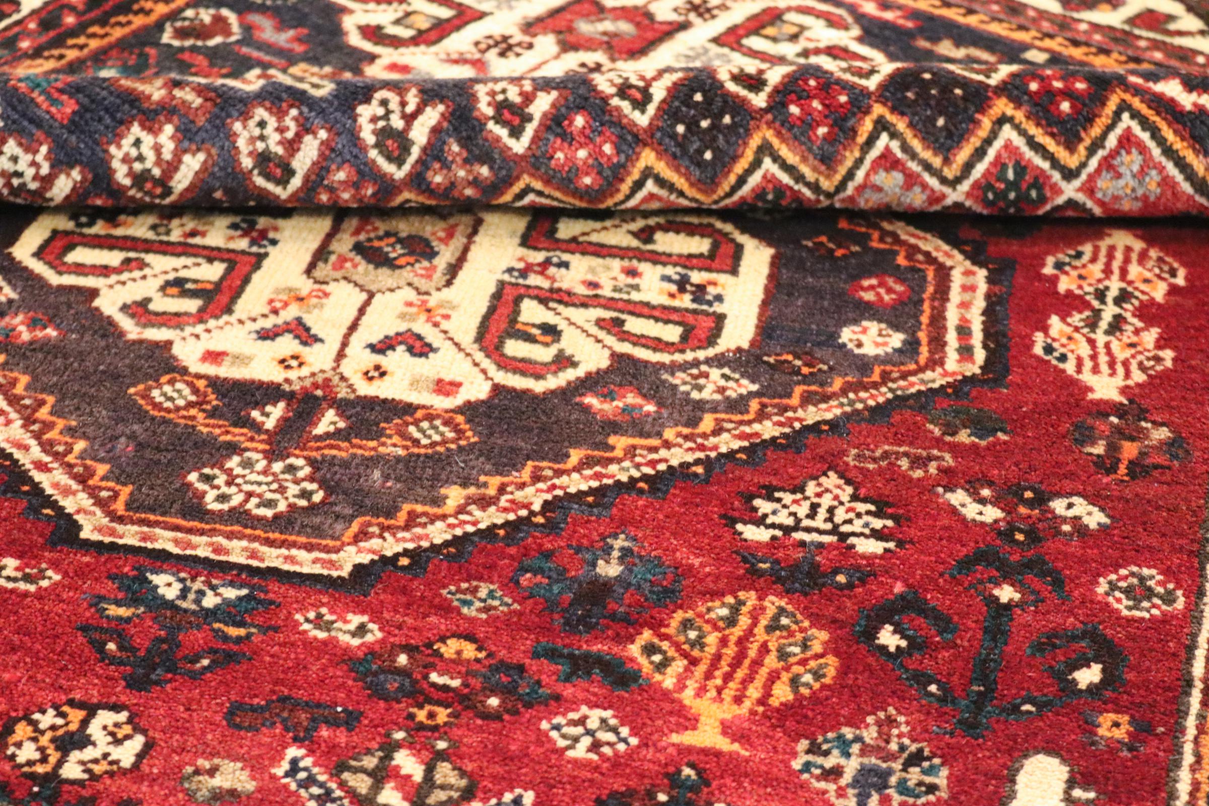 This rug belongs to village and nomadic rugs from Iran, formerly Persia. This type of rug is knotted by hand in smaller towns and villages in old tradition. Even nomads still knot Persian rugs in the open air. The rugs are knotted without a draft and completely from the mind. They are characterized by classical ornaments, which are arranged in straight and geometrical patterns. Thanks to their cultural-traditional origin, these rugs have a unique character that embodies ancient Persia.