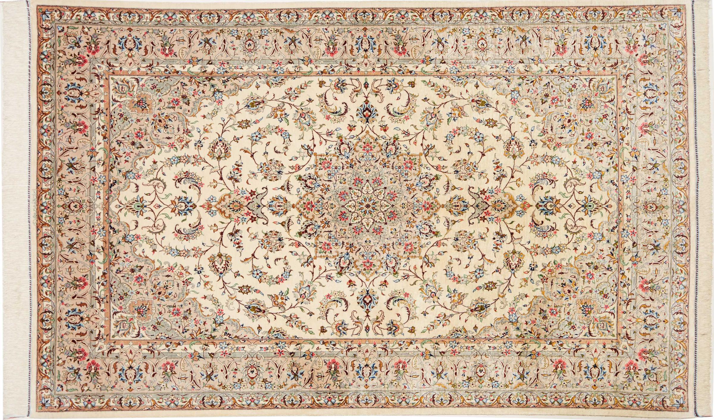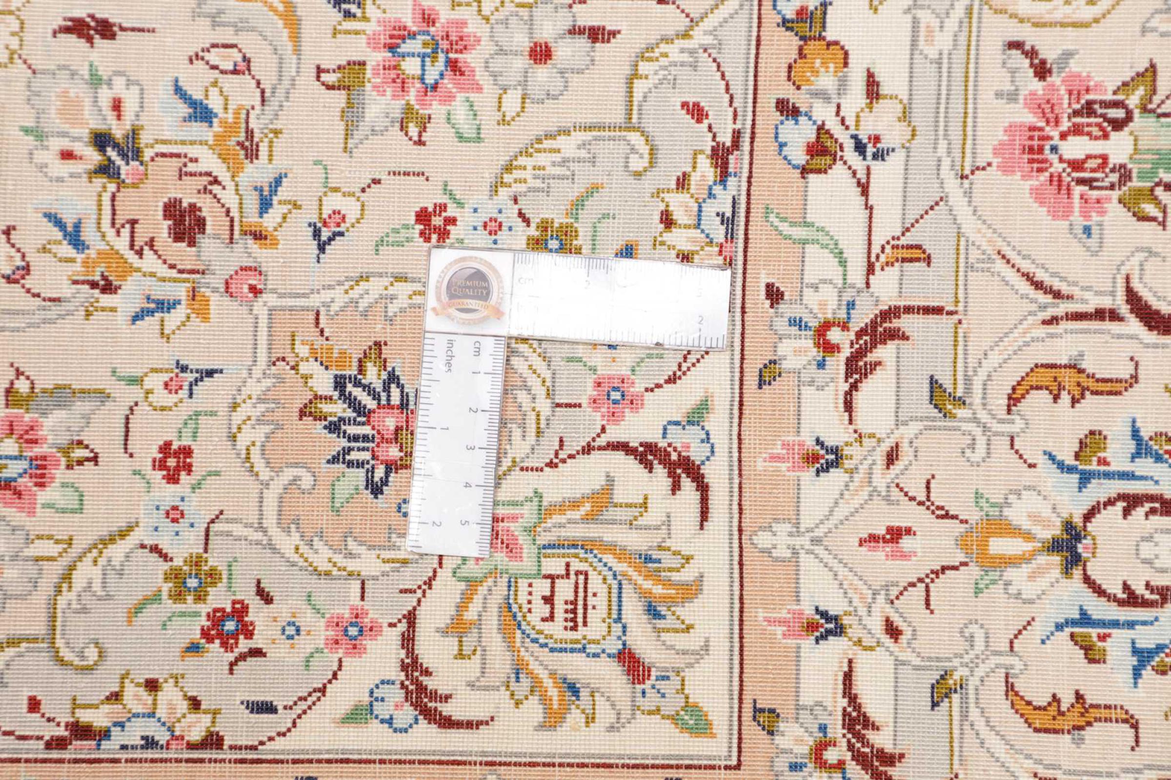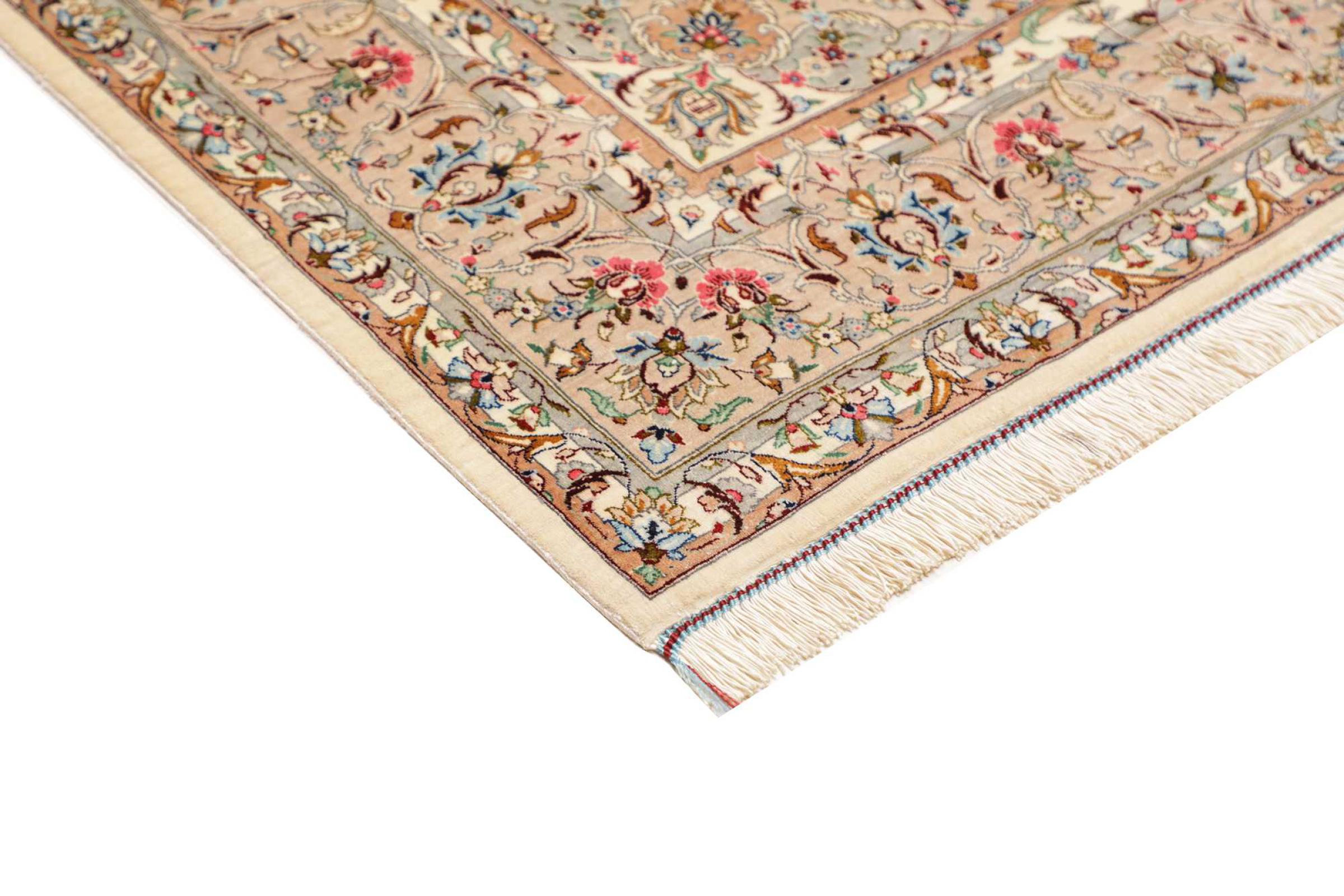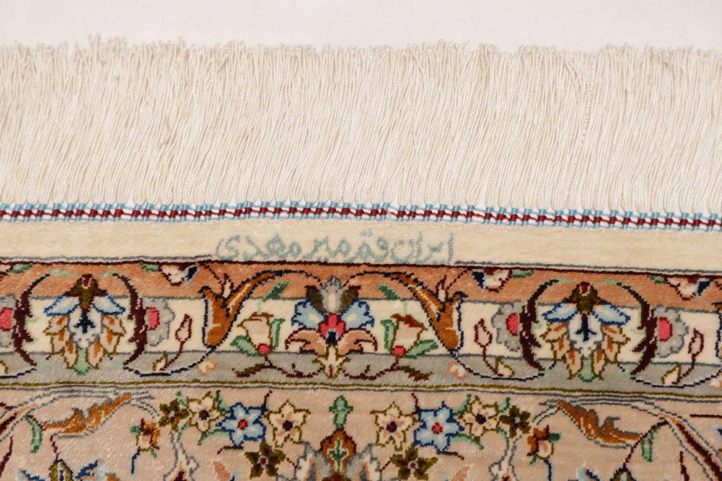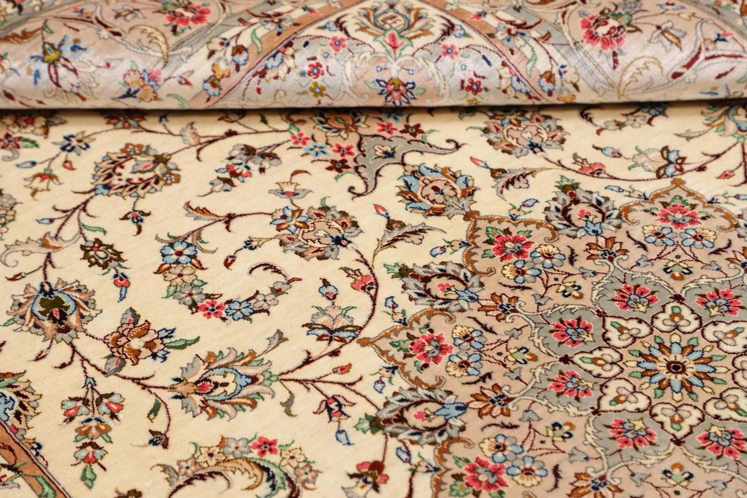 This Qum (also called: Qom) carpet is pure luxury for your home. It consist of natural silk from the city Qum, which is known to possess the highest grade silk in Persia. Its astonishing ornaments made from silk are going to impress without any doubt. The silk reveals new colours and details depending on the angle of how light is reflected. This carpet is a unique piece of art, which you wouldn't want to miss anymore.