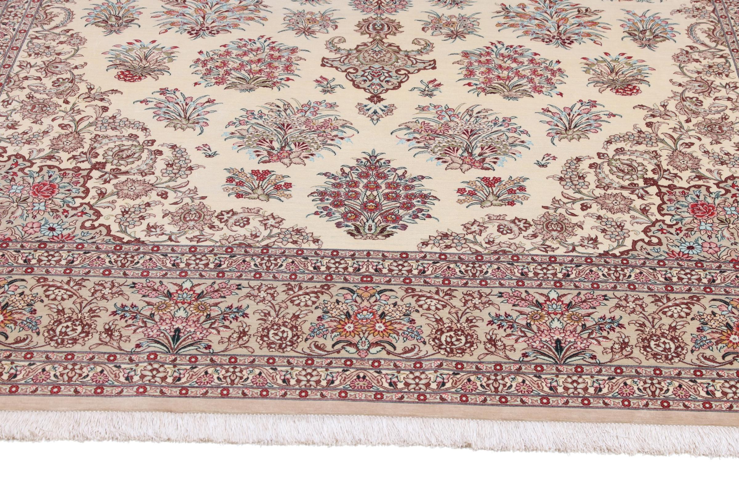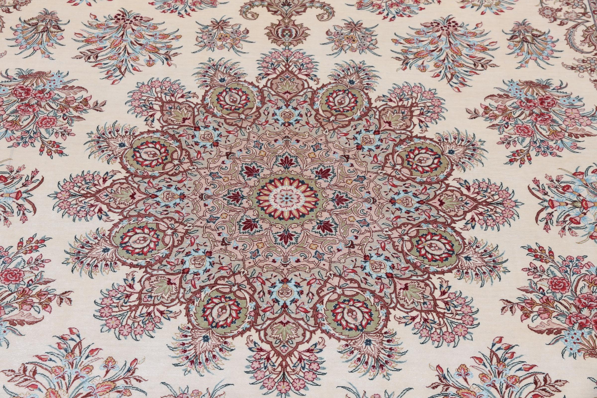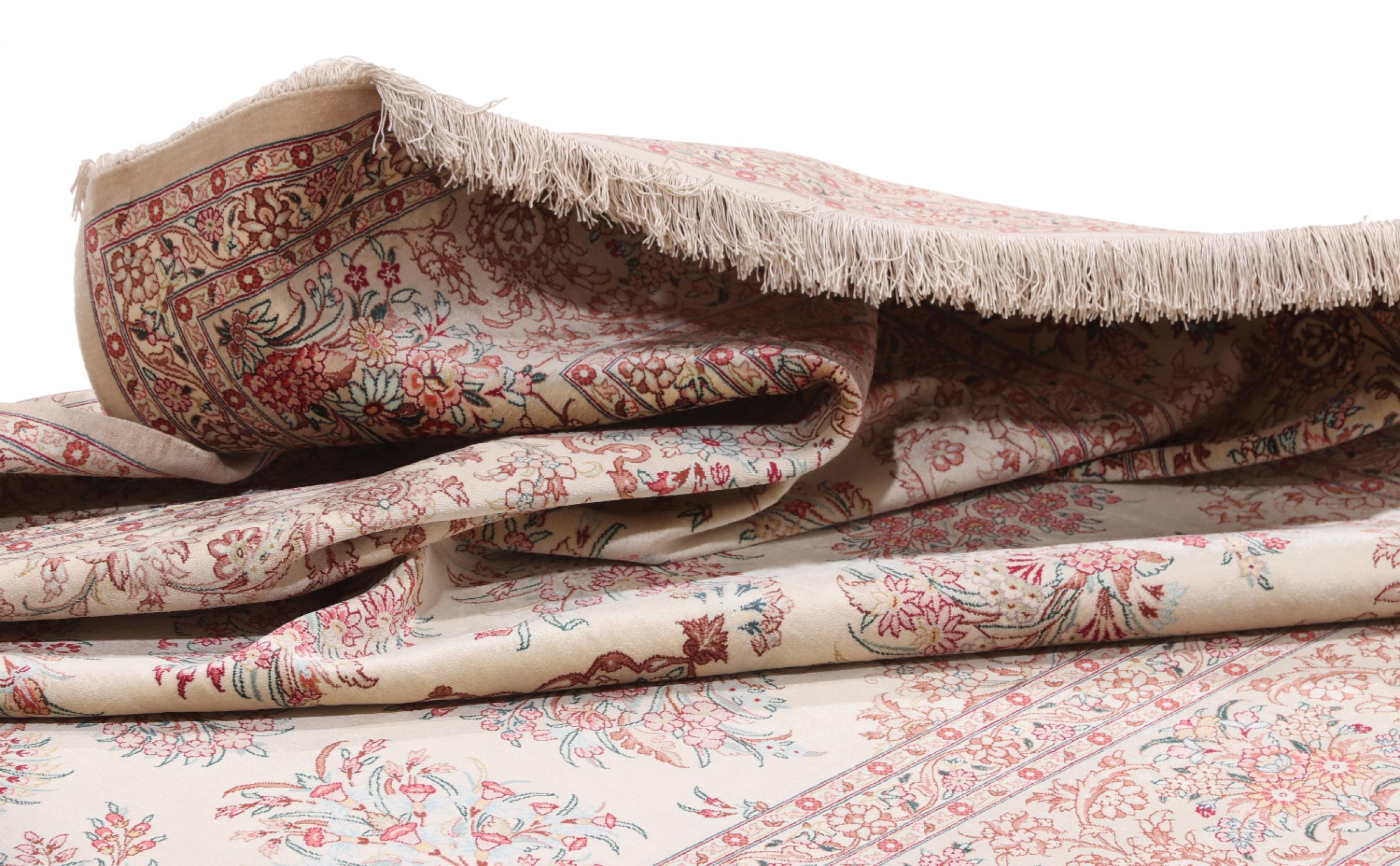 This Qum (also called: Qom) carpet is pure luxury for your home. It consist of natural silk from the city Qum, which is known to possess the highest grade silk in Persia. Its astonishing ornaments made from silk are going to impress without any doubt. The silk reveals new colours and details depending on the angle of how light is reflected. This carpet is a unique piece of art, which you wouldn't want to miss anymore.