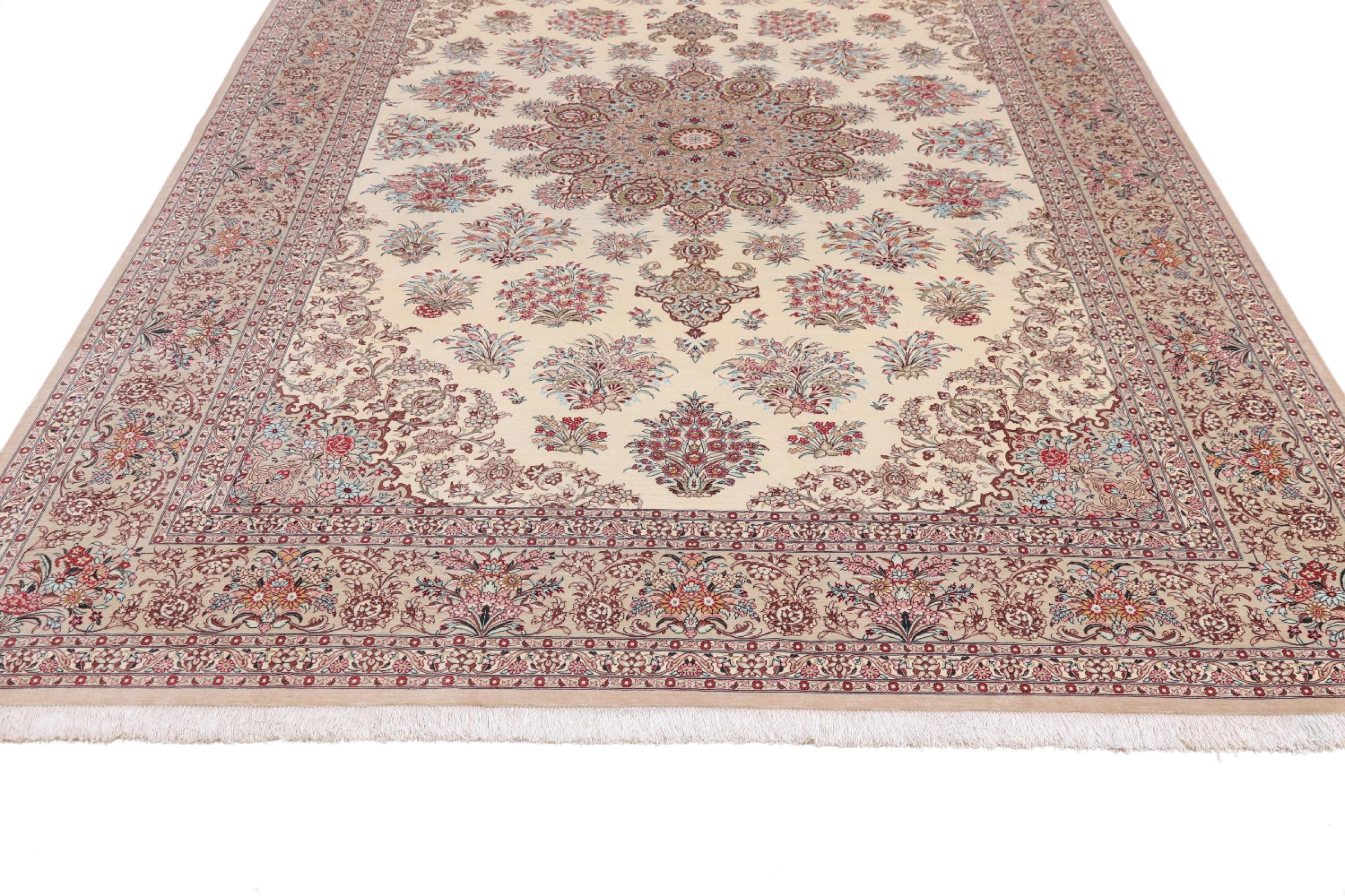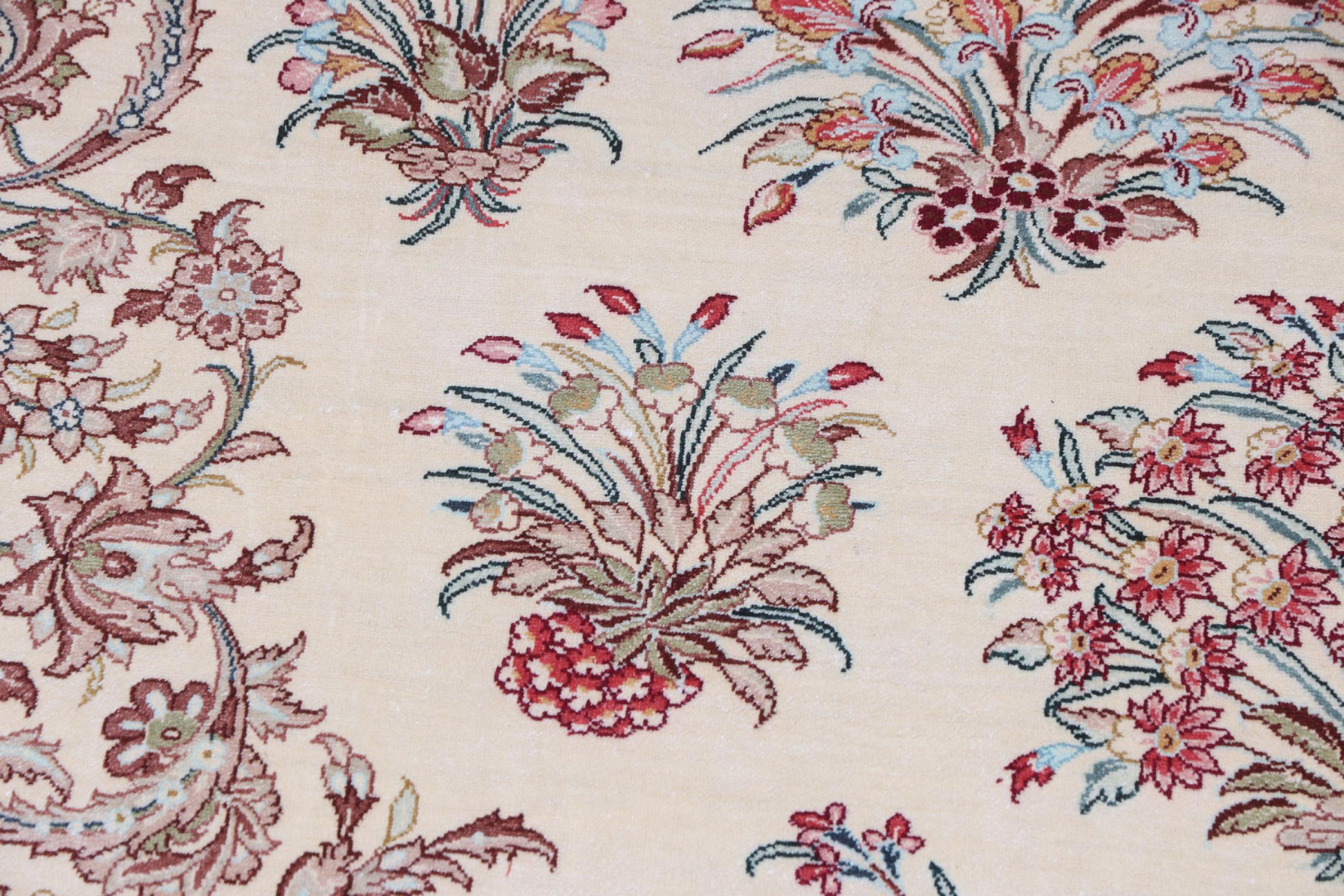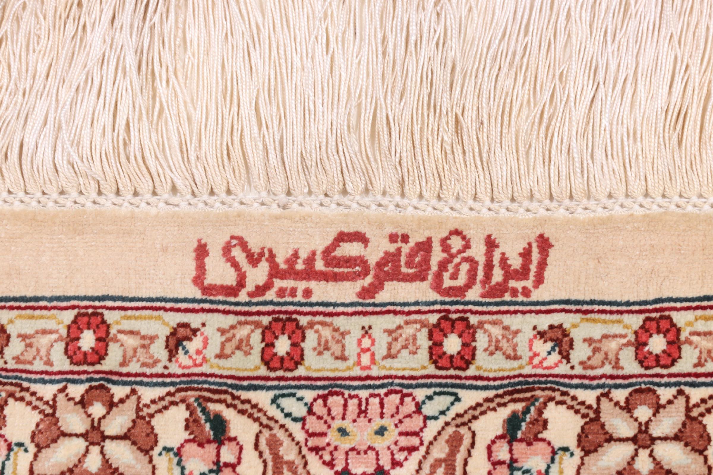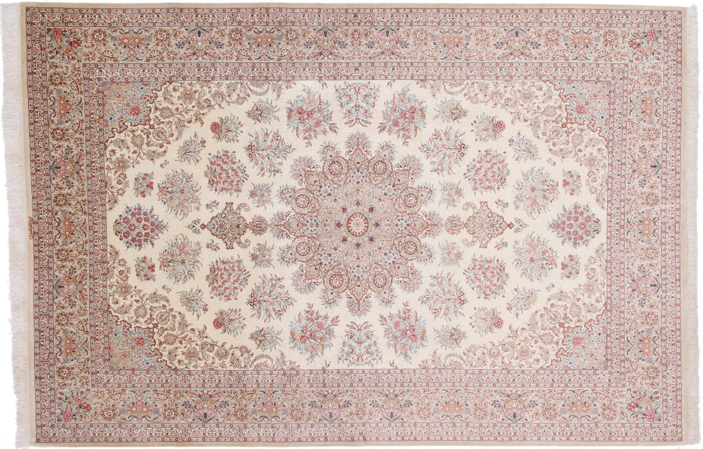 This Qum (also called: Qom) carpet is pure luxury for your home. It consist of natural silk from the city Qum, which is known to possess the highest grade silk in Persia. Its astonishing ornaments made from silk are going to impress without any doubt. The silk reveals new colours and details depending on the angle of how light is reflected. This carpet is a unique piece of art, which you wouldn't want to miss anymore.