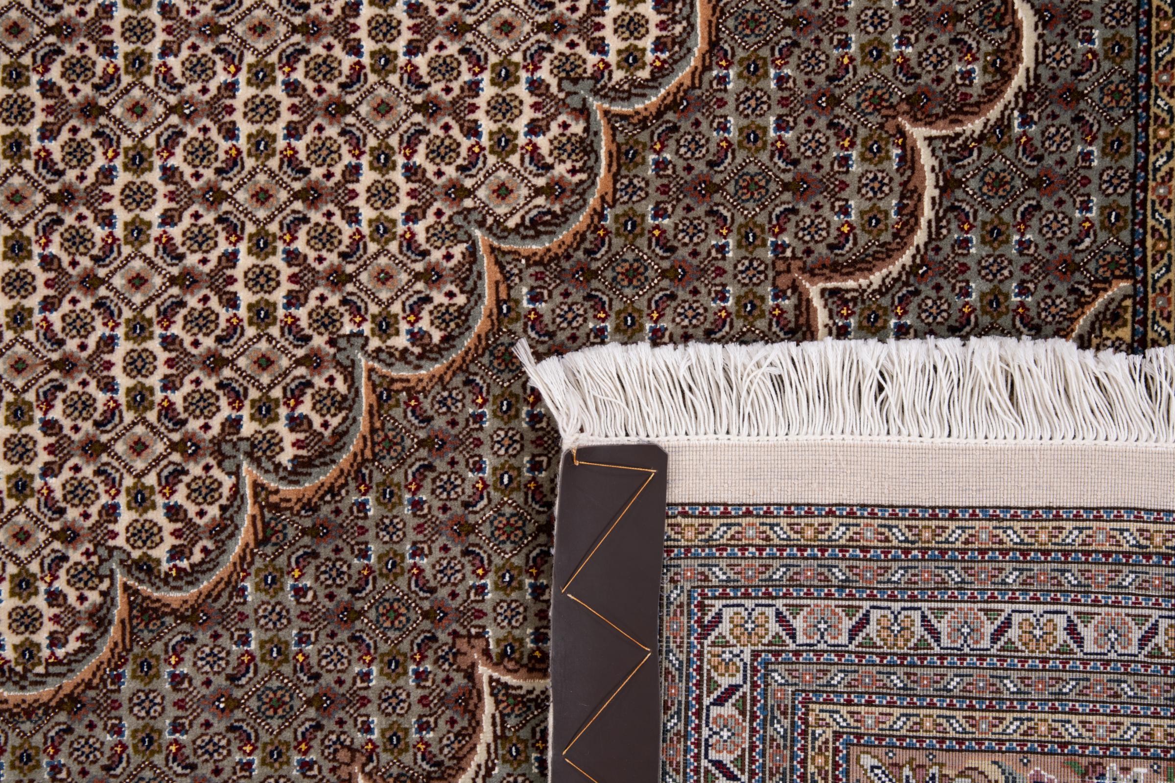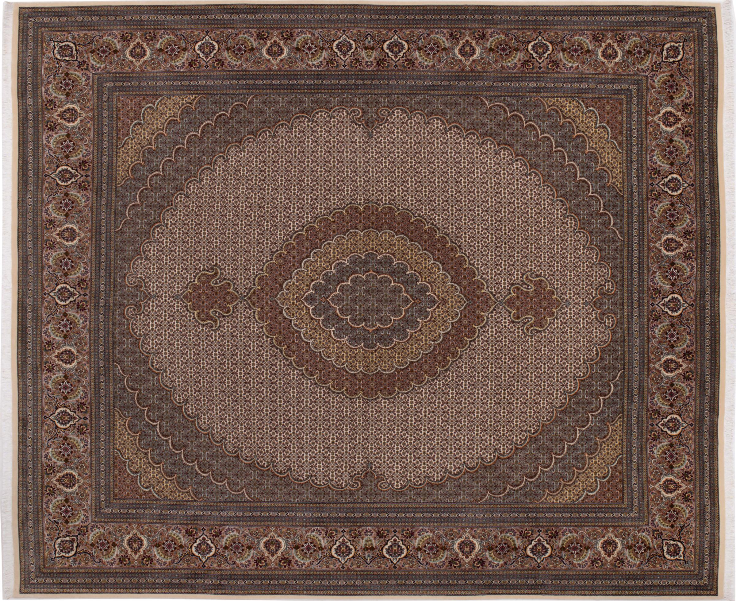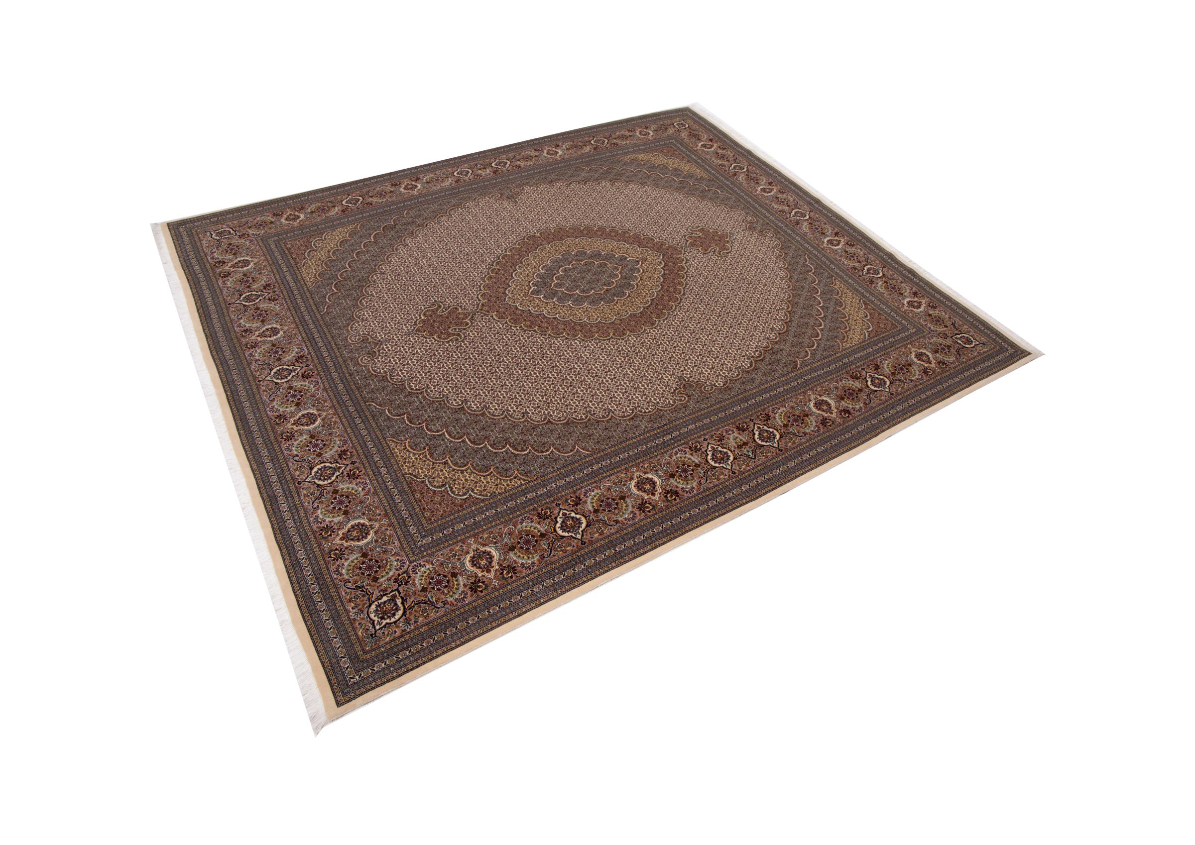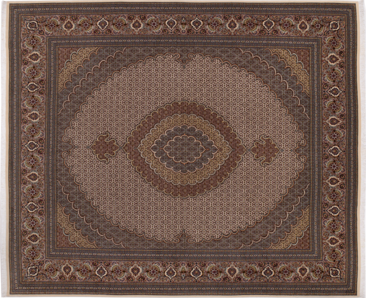 Carpet ID: 292747001651377 Size: 305x252 cm Thickness: ap. 7 mm Knot density: 440 000 - 490 000 / m² Manufacturing: Knotted by hand Pile: Wool with silk Warp: Cotton Origin: Persia Age: New Weight: ap. 23 kg Also know as Tabriz, Tabris, Täbris, Tebriz, Tebris, 40Raj, 50Raj In stock: Unique - Only 1 in stock