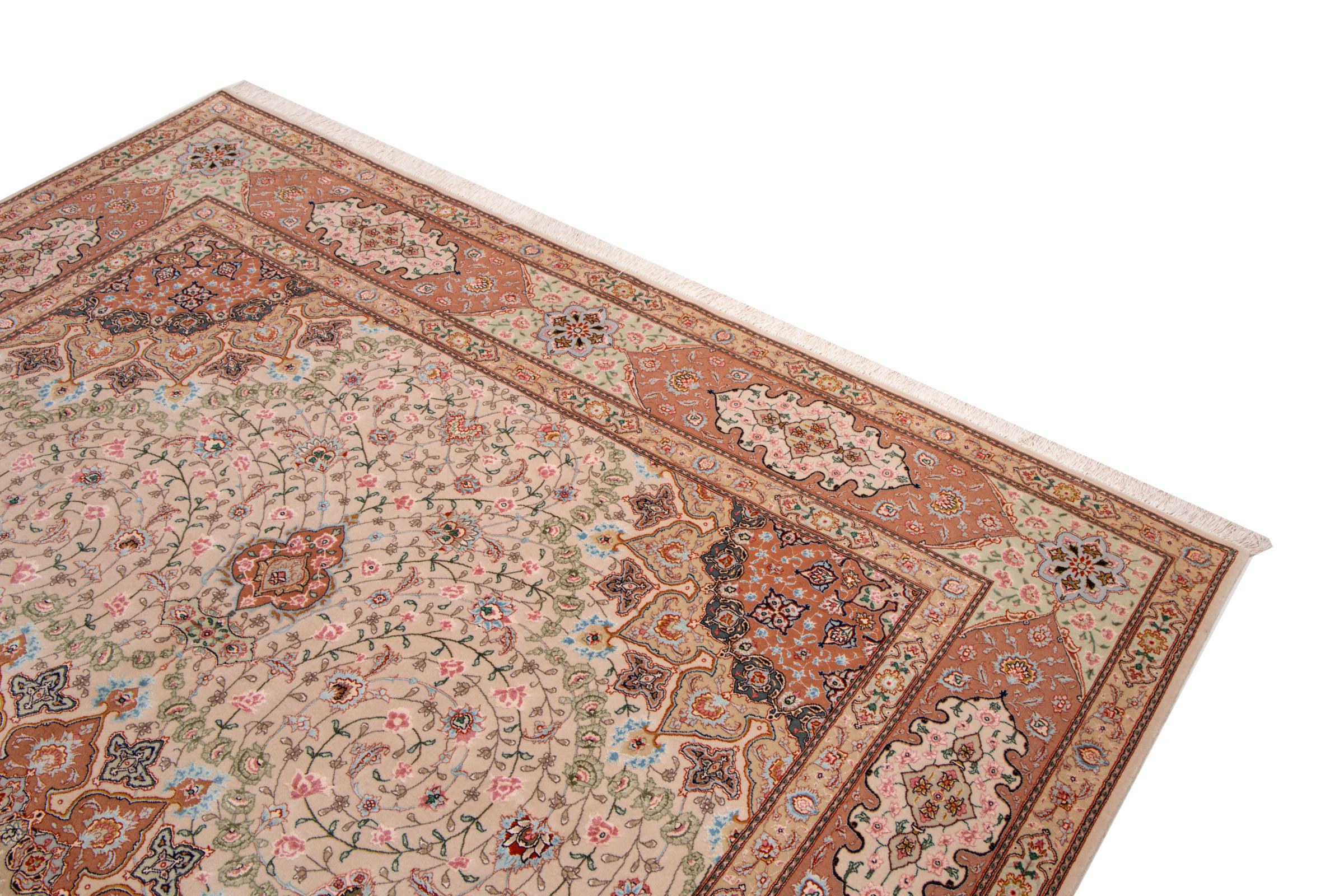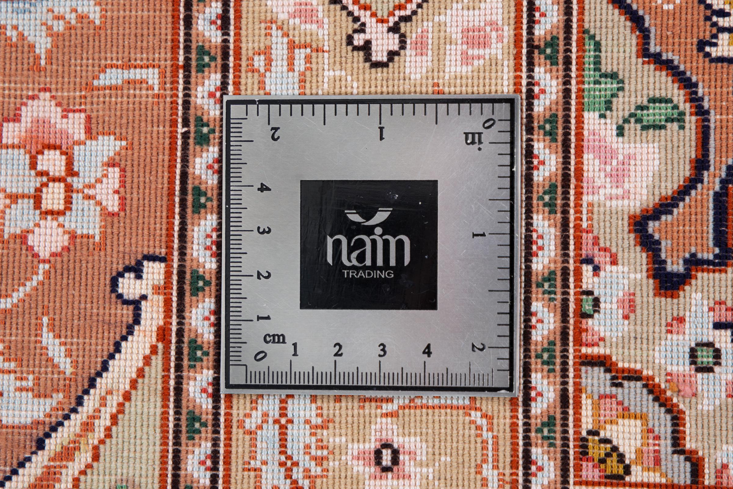 Carpet ID: 293824003340629 Size: 347x243 cm Thickness: ap. 6 mm Knot density: 850 000 / m² Manufacturing: Knotted by hand Pile: Wool with silk Warp: Silk Origin: Persia Age: New Weight: ap. 25 kg Also know as Tabris, Tabriz, Tebris, Tebriz, Täbris, 70Raj In stock: Unique - Only 1 in stock