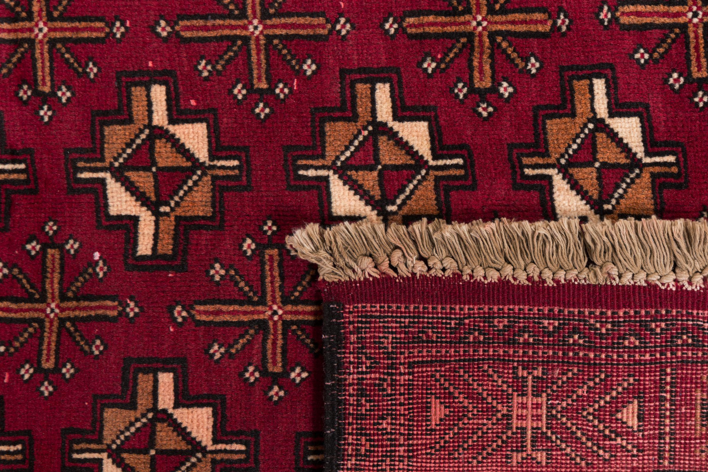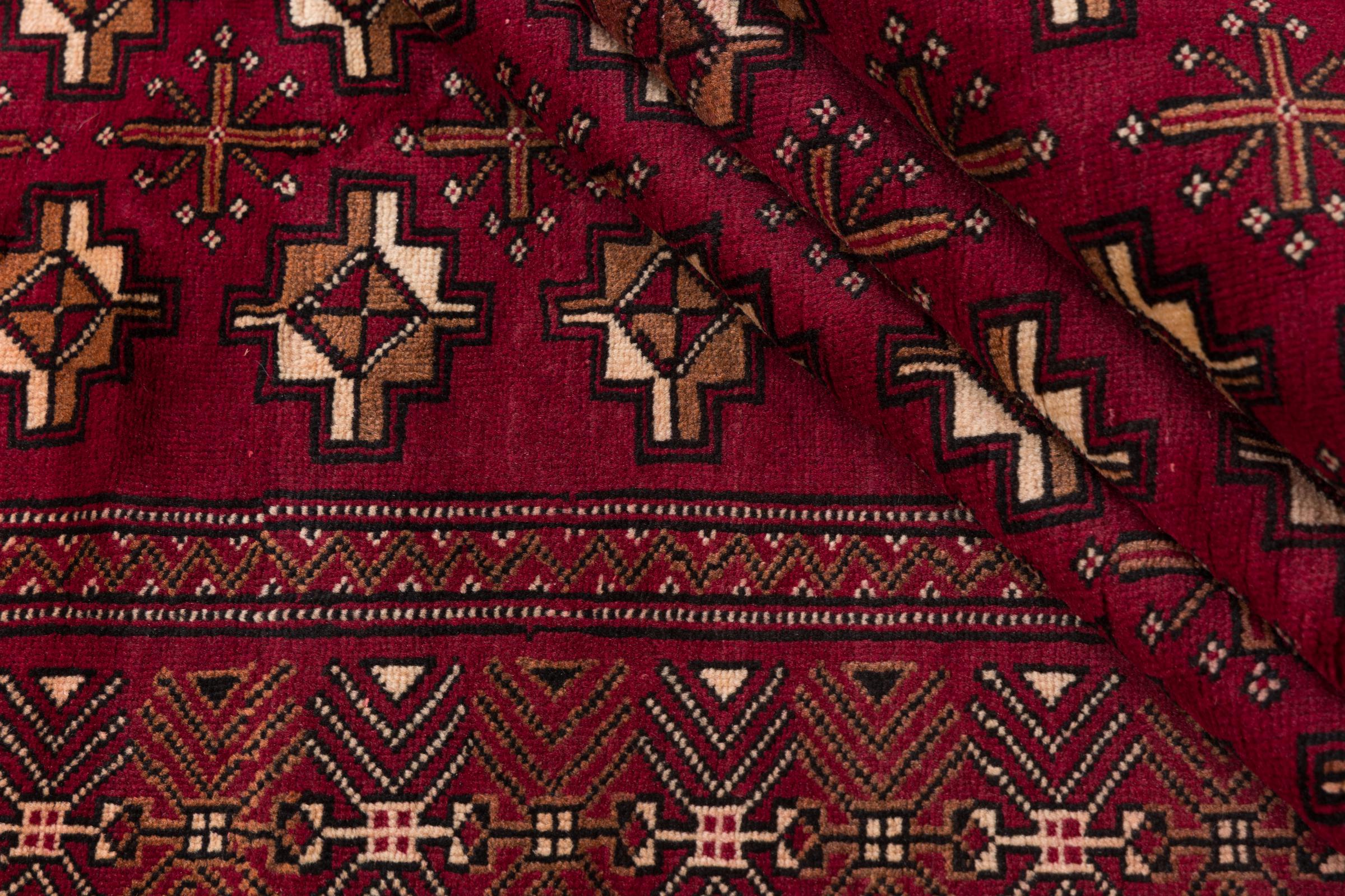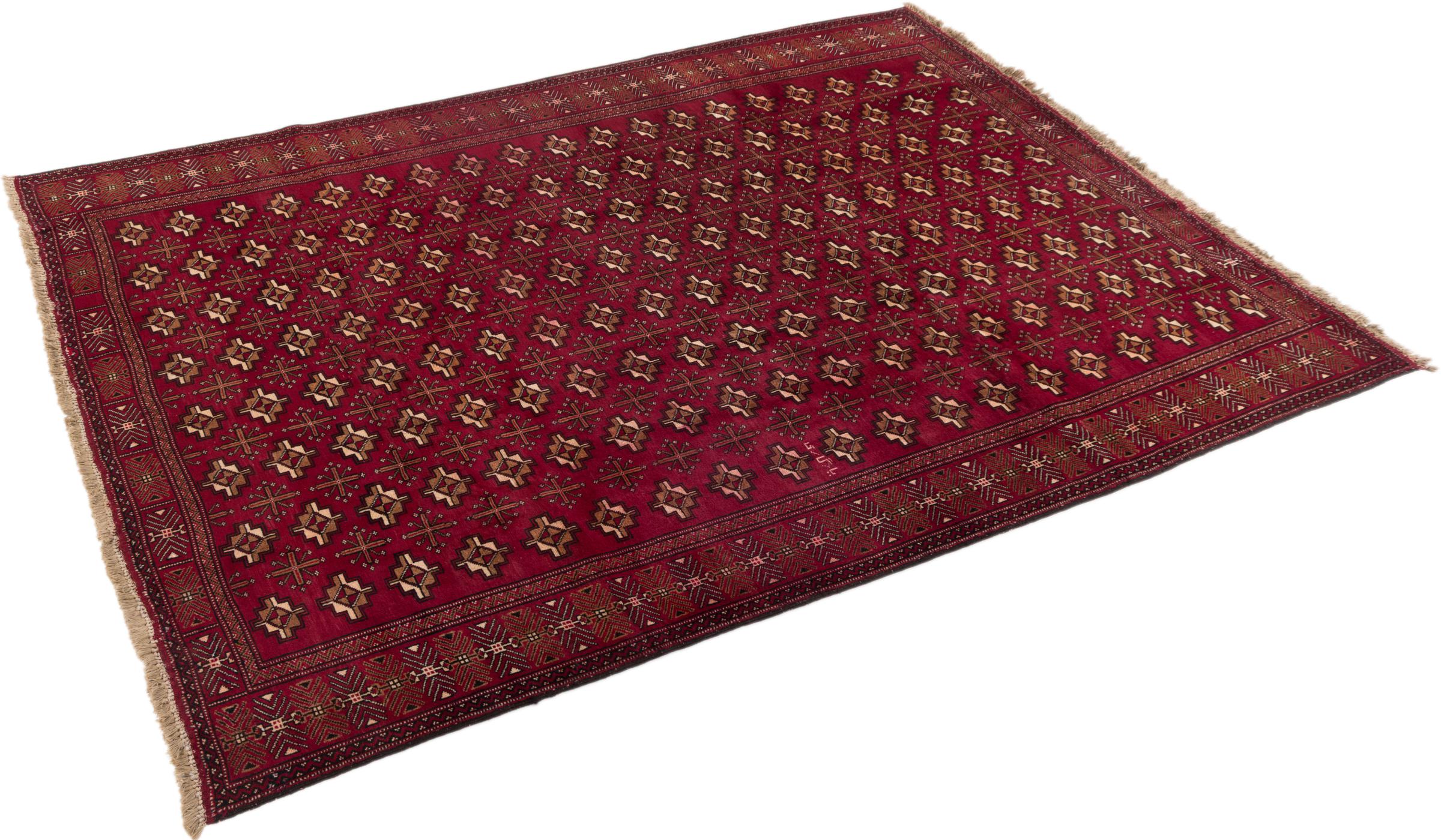 This Turkaman rug was knotted in traditional handicraft and convinces with its high production standard and the high-quality sheep's wool with high fat content. Its dark, warm colours reflect the Turkmen culture and add a touch of orient and cosiness to your home. Pakistani carpets often resemble this type of carpet, but often fail to match its quality.