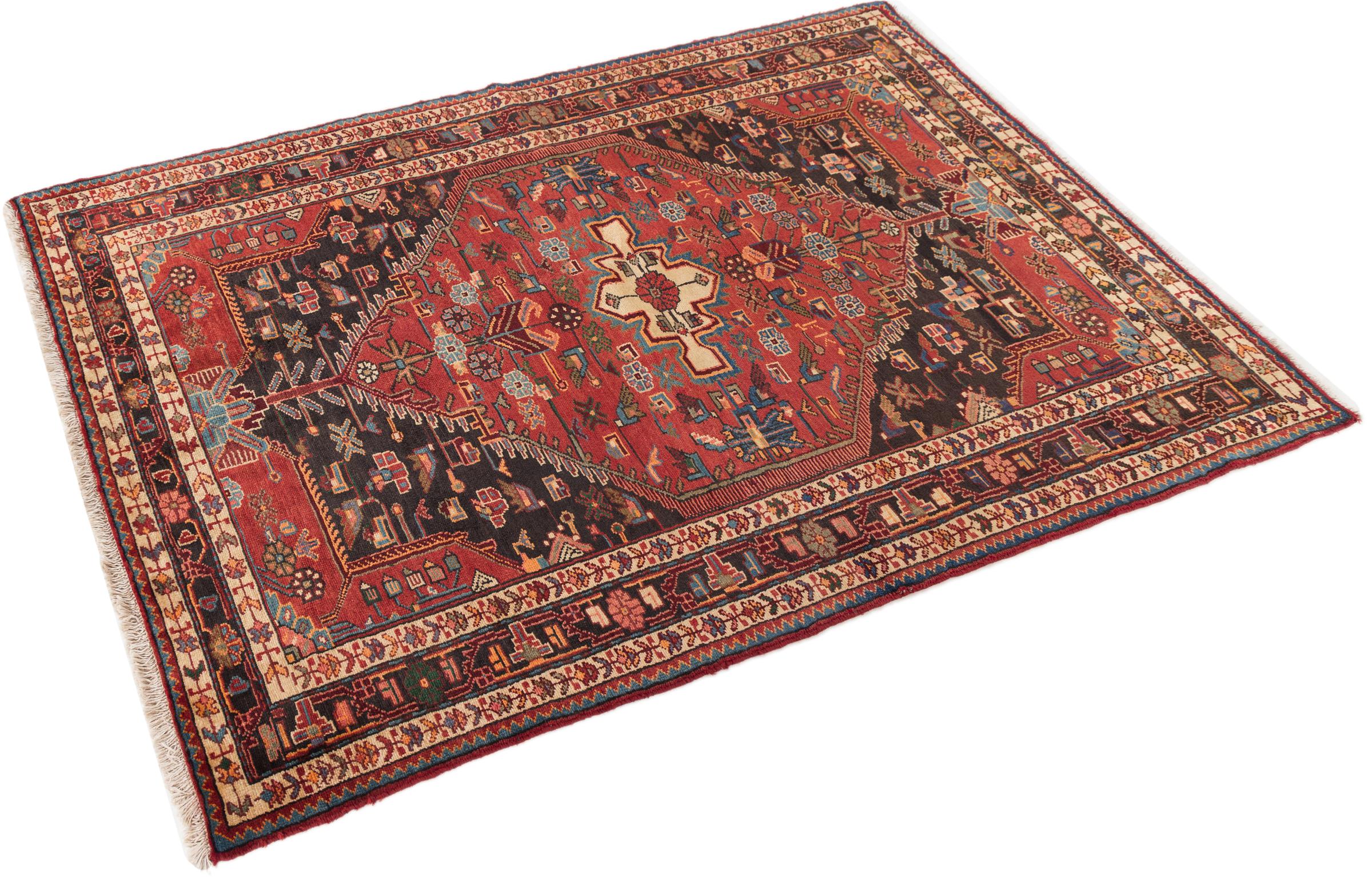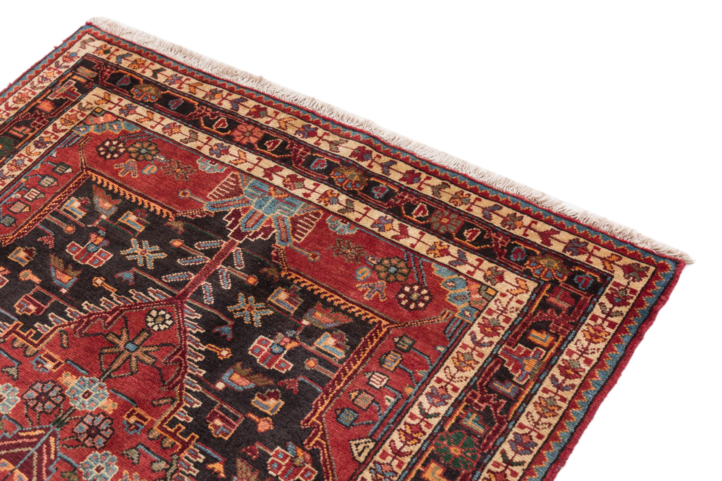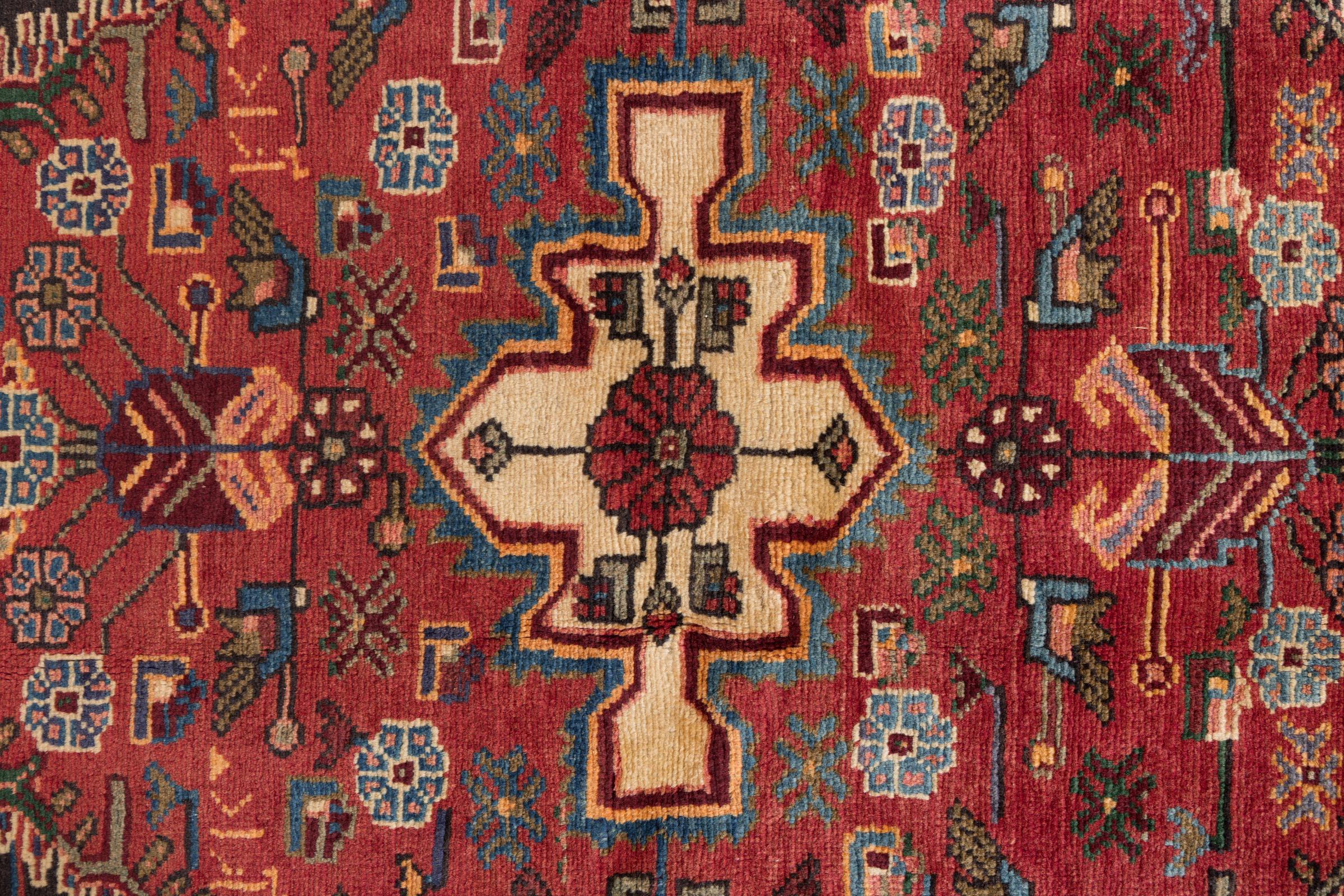 This rug belongs to village and nomadic rugs from Iran, formerly Persia. This type of rug is knotted by hand in smaller towns and villages in old tradition. Even nomads still knot Persian rugs in the open air. The rugs are knotted without a draft and completely from the mind. They are characterized by classical ornaments, which are arranged in straight and geometrical patterns. Thanks to their cultural-traditional origin, these rugs have a unique character that embodies ancient Persia.