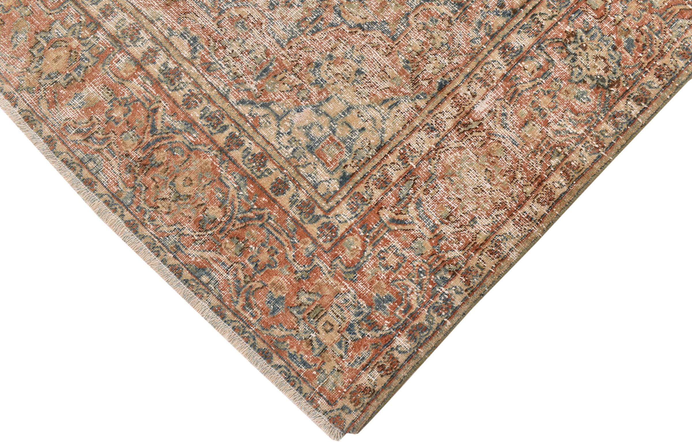 This is a hand-knotted Persian carpet that is at least 20 years old. Such a carpet can last for generations with the right care. The carpet has been completely re-dyed without completely over-dyeing the originally knotted ornaments. This gives the high quality Persian carpet a unique modern vintage character.